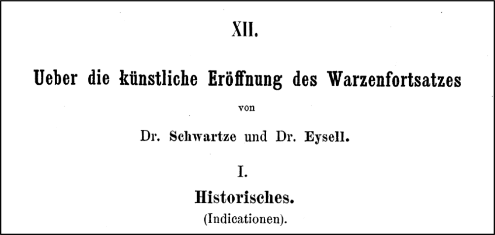 In the 1875 volume XXI of the Nouveau dictionnaire de médecine et de chirurgie pratique (New practical dictionary of medicine and surgery), there is: “Very recently, Schwartze and Eysell, through the analytical study of a large number of facts, demonstrated all the advantages that can be obtained from mastoid perforation” [42].