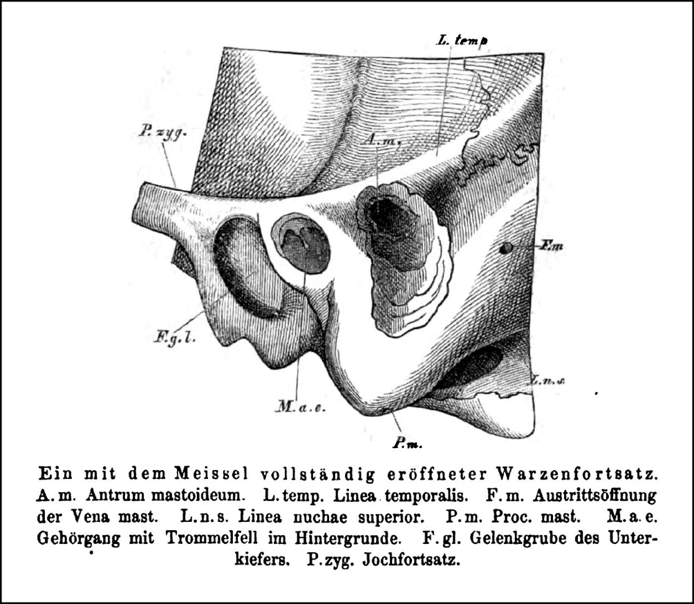 Reprint from an 1873 textbook of otology from Anton von Tröltsch (Lehrbuch der Ohrenheilkunde, 5th ed., Leipzig: Vogel, 1873, p. 451) showing a drawing of a completely opened mastoid process with the chisel, very similar to that in the original work by Schwartze and Eysell. A.m. mastoid antrum, F.g.l. glenoid (mandibular) fossa, F.m. Foramen of the mastoid vein, L.n.s. Linea nuchae superior; L. temp. Linnea temporalis, M.a.e. external auditory meatus with eardrum in the background, P.m. mastoid process, P.zyg. zygomatic process