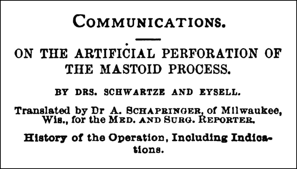 Reprint of the title of the article by Alois Schrapinger in the Medical and Surgical Reporter with a partial translation of the original publication by Hermann Schwartze and Adolf Eysell