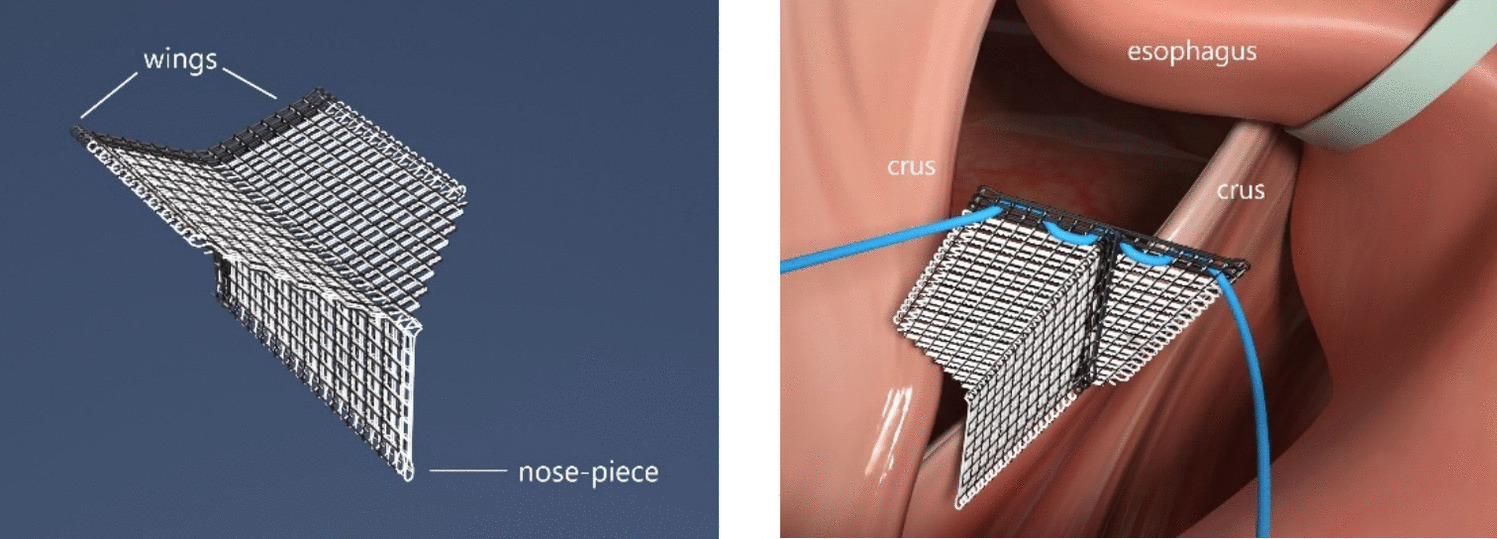 Left: 3D-structure of the DynaMesh®-DELTA surgical implant. Right: The nose-piece of the implant is placed between the crura, with the wings positioned in the mediastinal compartment