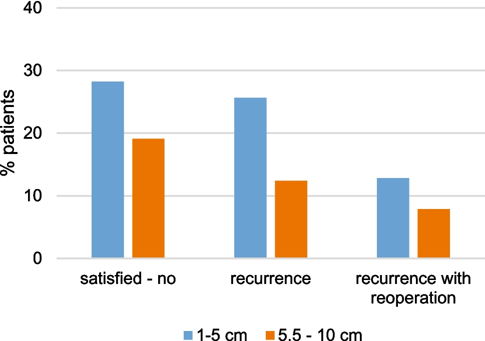We observed a higher recurrence rate in small hernias after mesh augmentation. At first sight, this finding is counterintuitive since large hernias have beeen associated with a greater risk of recurrence [40]. A possible explanation of this finding is the choice of the cutoff between small (≤ 5 cm) and large hernias (> 5 cm). In the present patient population, 65% of patients had hernias larger than 5 cm, 26% had hernias of 5 cm, and only 9% had hernias smaller than 5 cm. It is conceivable that the present distribution and relatively small sample size could have biased our findings.