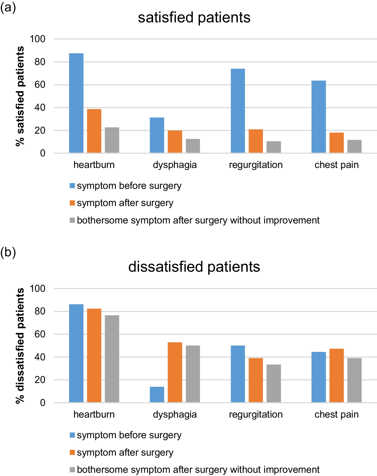 Typical symptoms of GERD consist of heartburn, esophageal chest pain and regurgitation. Heartburn and regurgitation are the most classical symptoms of GERD [25]. In the present study, approximately 87% of the GERD patients had heartburn and 67% had regurgitation as major symptoms when evaluated preoperatively. Patients with heartburn have shown reduced work productivity and significant impairments in health-related quality of life [27].