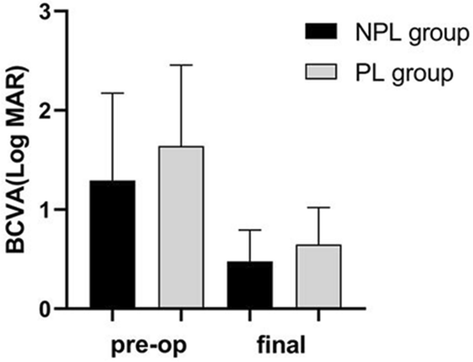 BCVA (Log MAR) preoperation and at the end of follow-up of the two groups