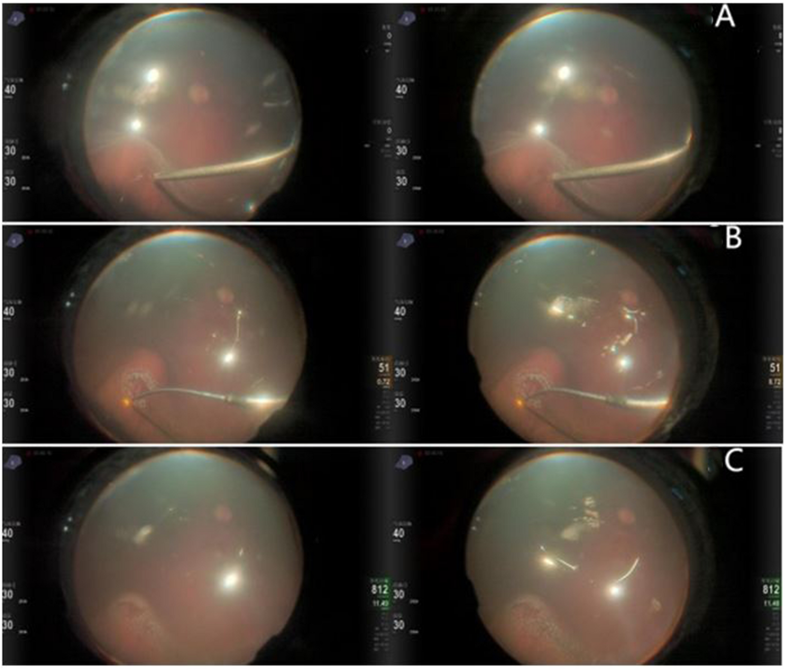 Images of fluid–air exchange and laser photocoagulation. A SRF is aspirated by fluid–air exchange through the original retinal break; B, C laser photocoagulation around the retinal break and degenerative area