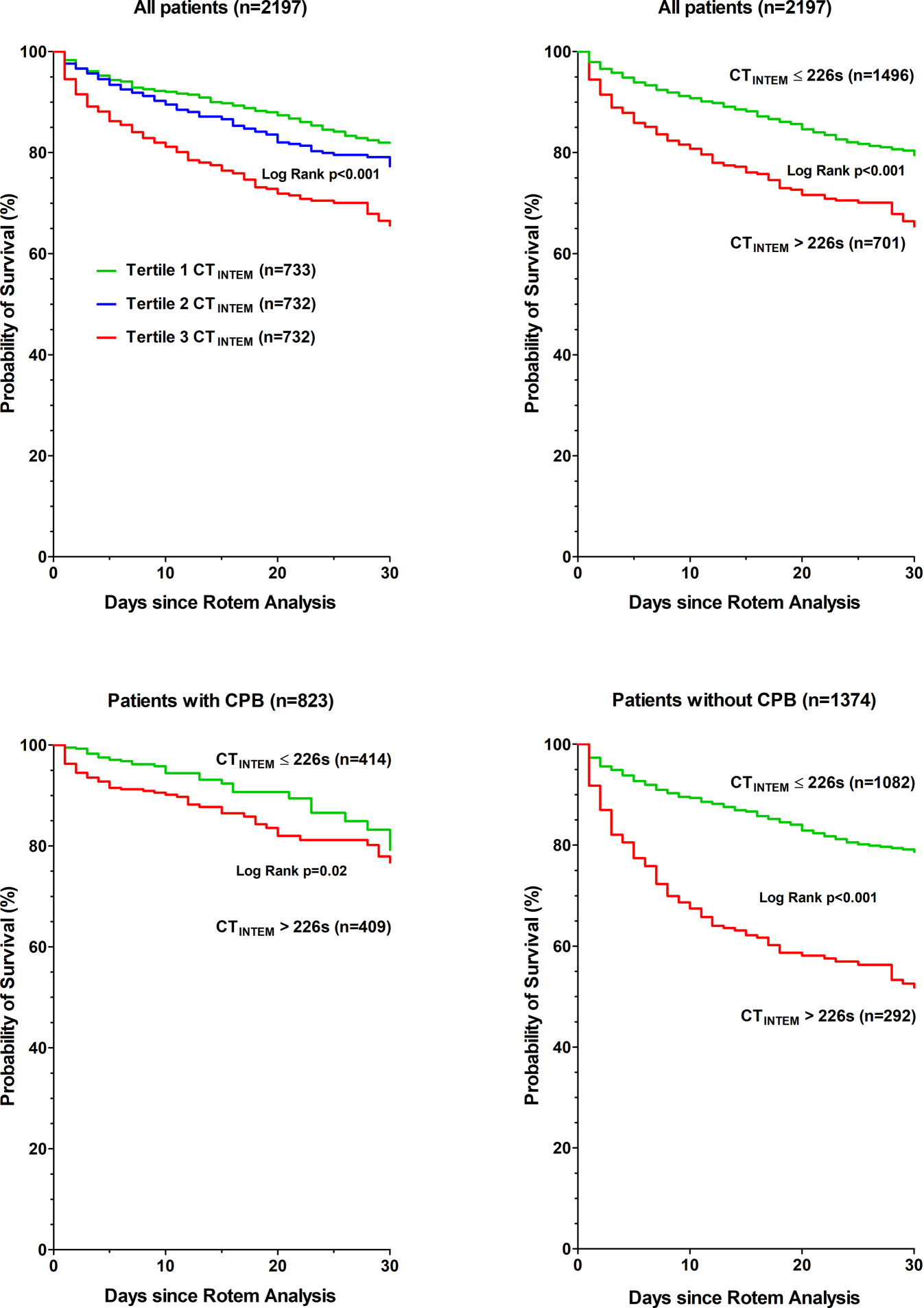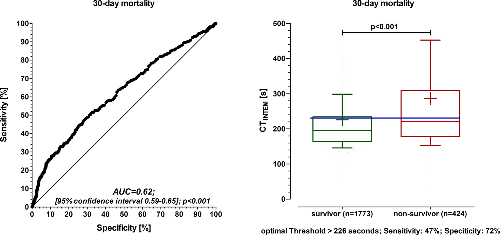 The results of the C‑statistic showed that CTINTEM (C statistic 0.62, optimal threshold > 226 s) had a predictive power for 30-day mortality. The determined threshold value of CTINTEM > 226 s remained an independent risk predictor for 30-day mortality even after adjustment for confounding factors (adjHR 2.6, 95% CI 2.1–3.2, p < 0.001). The 30-day mortality rate was significantly increased in the group with CTINTEM > 226 s (29% versus 15%, p < 0.001). A multivariable analysis showed that treatment with fresh frozen plasma was not associated with increased 30-day mortality in patients with CTINTEM > 226 s, in contrast to all patients.