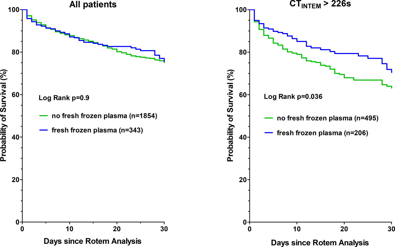 Our aim was therefore to investigate the relationship between CTINTEM, 30-day mortality and fresh frozen plasma treatment. Our primary hypothesis was that there is an independent association between CTINTEM and 30-day mortality in patients with bleeding. Second, we hypothesized that fresh frozen plasma might be associated with 30-day mortality in patients with elevated CTINTEM.