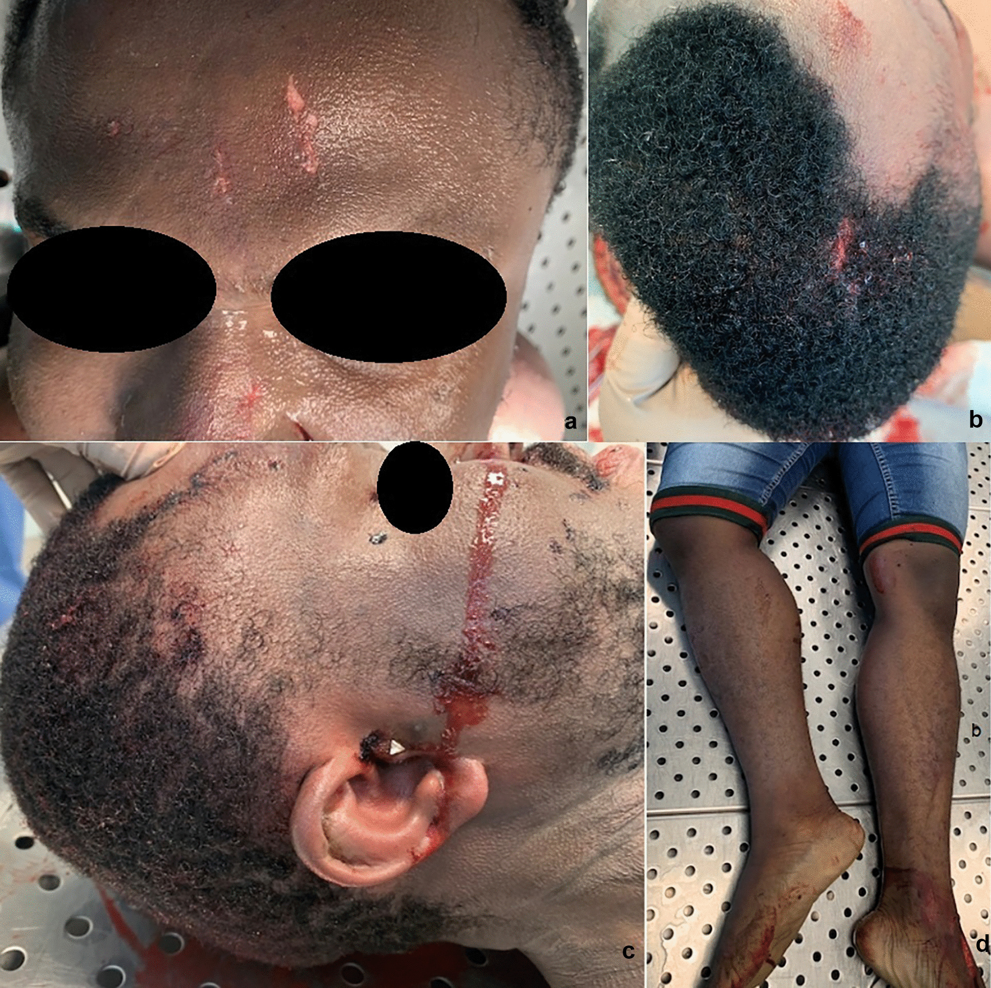 External examination. a Two abrasions in the frontal region. b 1-cm lacerated wound in right front-parietal region. c Blood-serum material from the nostrils. d Right lower limb extra-rotation