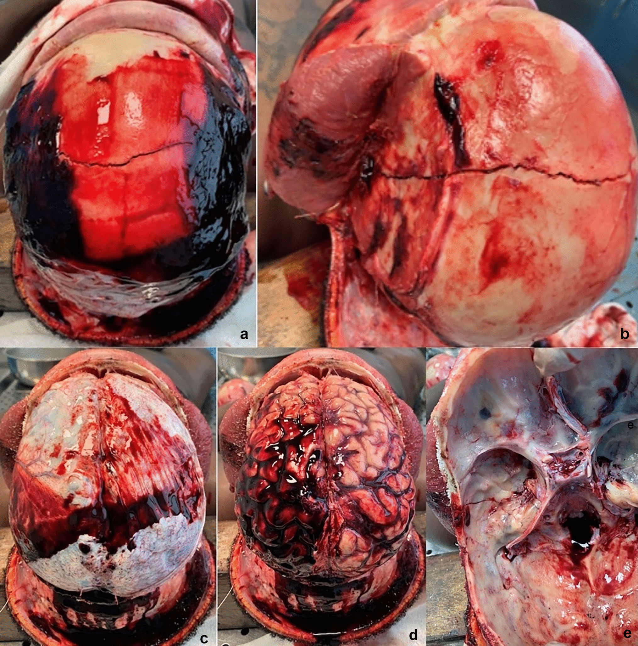A dura mater painted with blood (Fig. 2c) and a sub-dural hemorrhage at the level of the left cerebral hemisphere were detected (Fig. 2d). Once the brain was removed, it was discovered that the fracture of the vault of the skull continued up to the left petrous rock at the level of the cranial base, and a hairline fracture with coronal course on the right orbital roof (Fig. 2e).