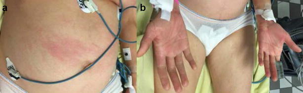 Abdominal (a) and palmar (b) evanescent erythema observed in a 37-year-old woman with pain of the left lower quadrant with guarding, 48 h after delivery