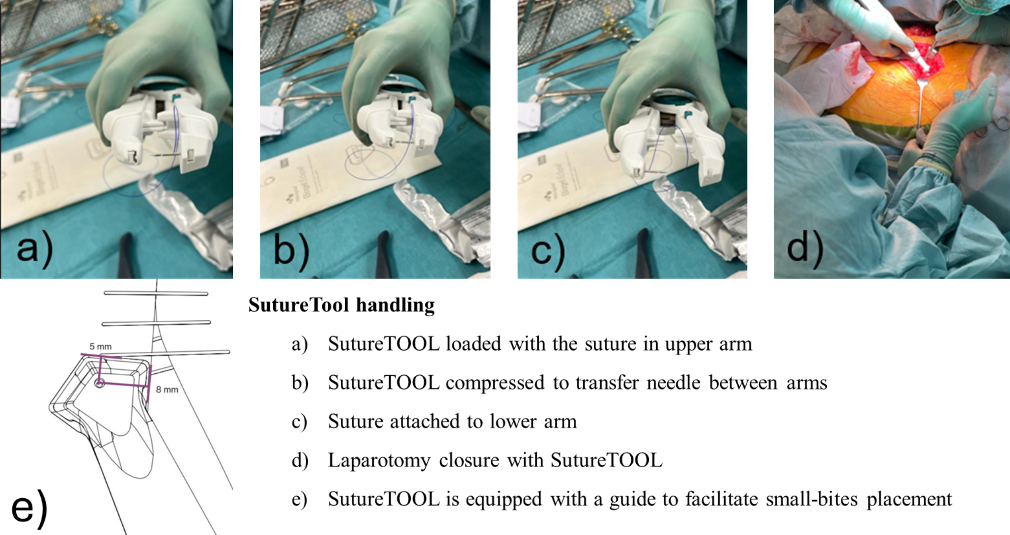 To facilitate implementation of the small-bites technique a suturing device, SutureTOOL (Suturion, Lund, Sweden) has been developed for swift and standardized laparotomy closure [