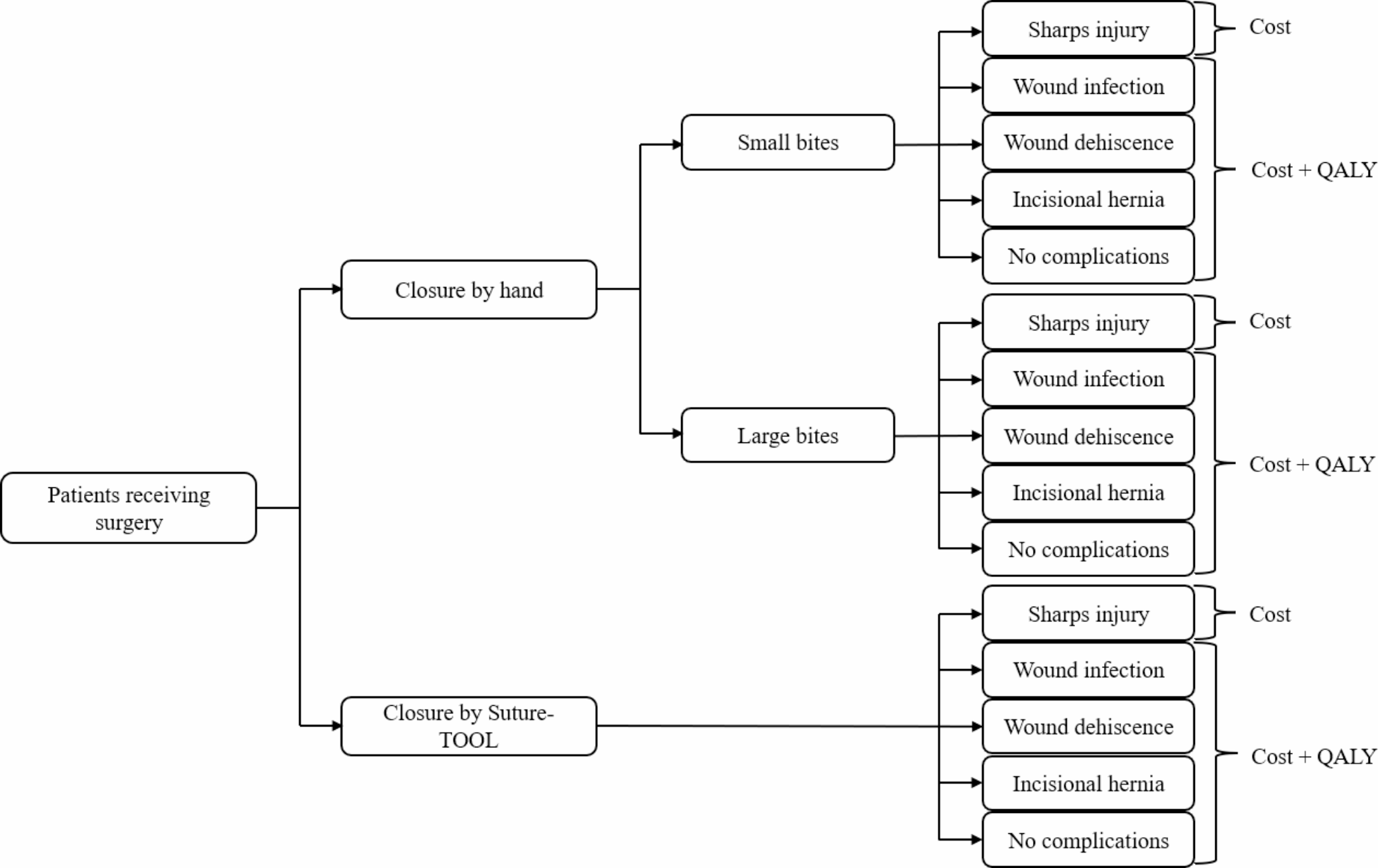 22] performed a cost-utility analysis to compare outcomes after small-bites and large-bites technique for laparotomy closure and the change in quality-adjusted life years (QALYs) with the UK public health provider National Health Service (NHS) perspective rather than a societal perspective. The study assessed the cost implications of adopting small-bites as standard practice and the impact of small-bites as standard practice on QALY measures. The analysis of the added operation time (4,6 min) cost for small-bites suturing (£92 per patient) deemed small-bites to be cost-effective provided a decrease in absolute wound infection rates by more than 15%, or absolute incisional hernia rates by more than 3.4%. While SutureTOOL facilitates small-bite laparotomy closure, the additional equipment comes with a cost and changes how the procedure is performed. The cost-effectiveness of the SutureTOOL, accounting for these changes, has not yet been explored to inform procurement decisions.