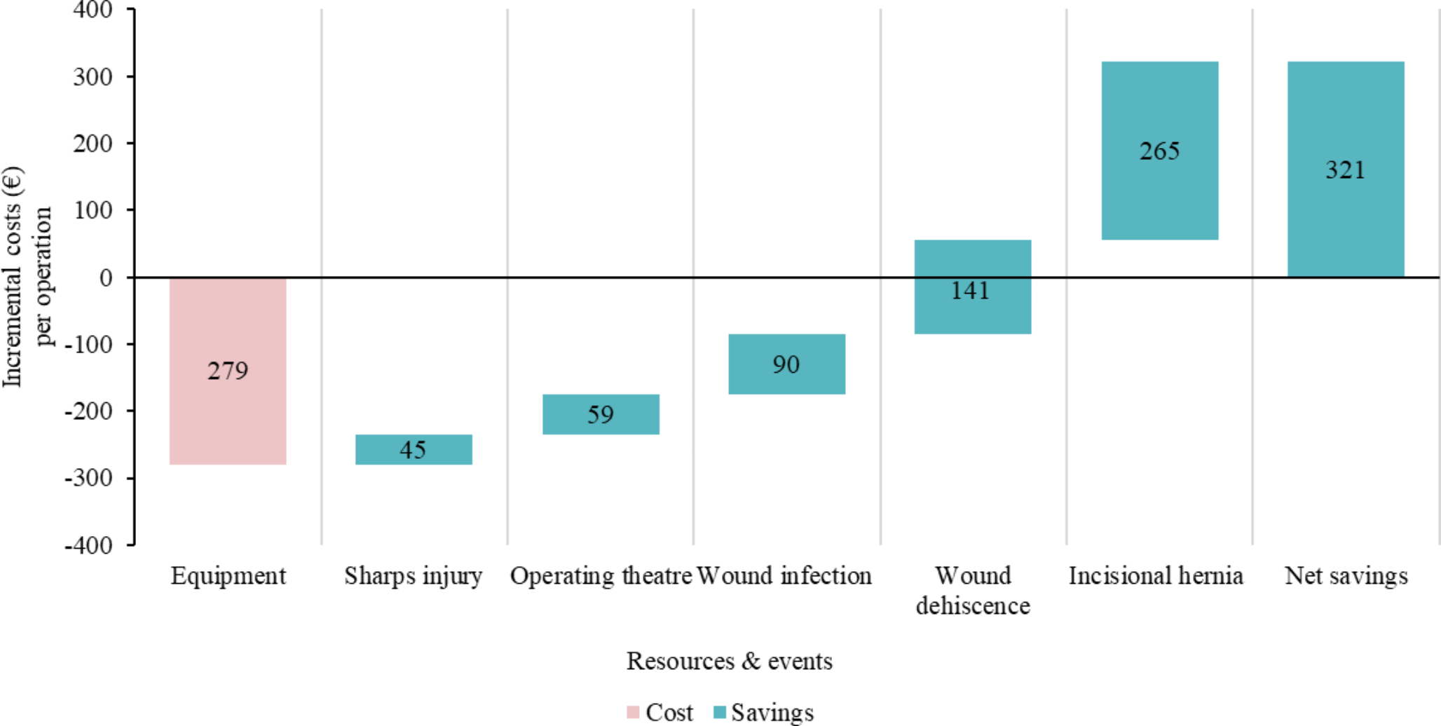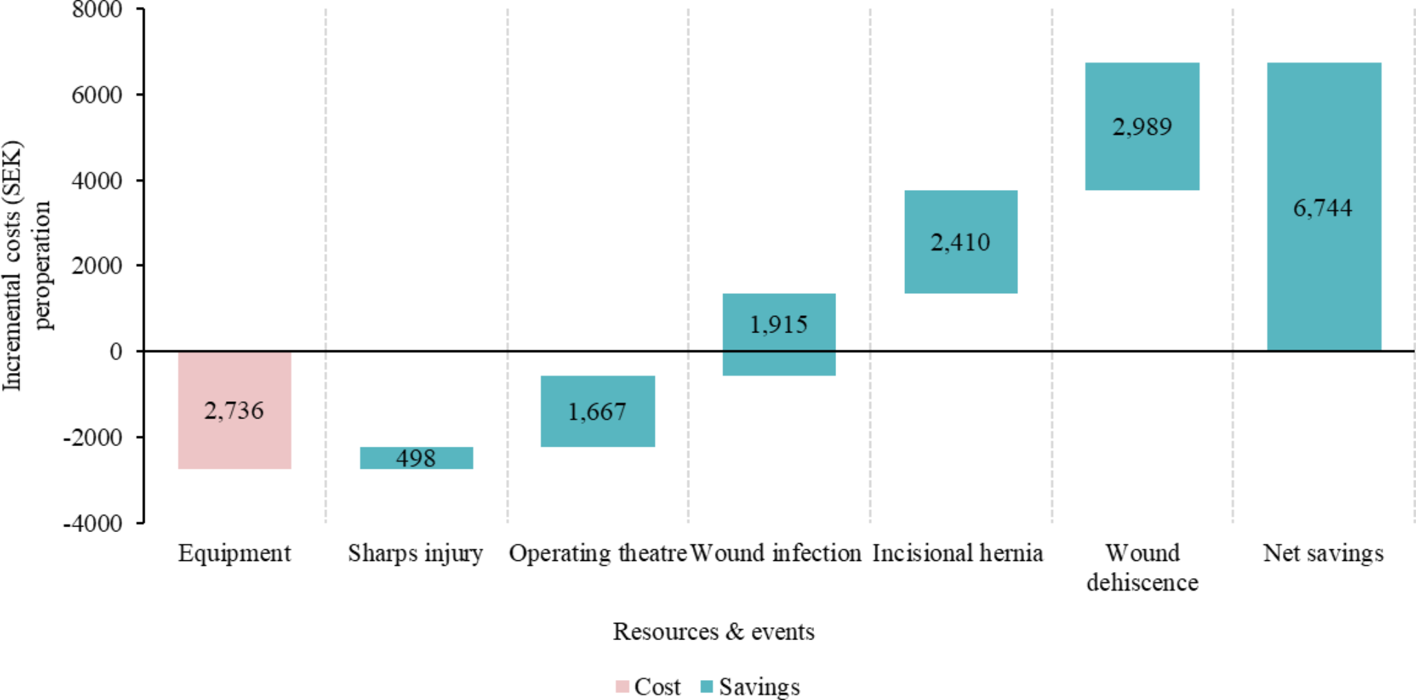 21] included data from a Swedish randomized clinical trial (2001–2006) comparing postoperative complications after laparotomy closure with small-bites and large-bites on patients undergoing laparotomy for colorectal cancer. The health economic analysis was performed from a societal perspective, included direct and indirect costs, and found a cost reduction of 2,415 SEK in patients that had a midline incision with small-bites, approximately $230 in 2013. Gokani et al. [