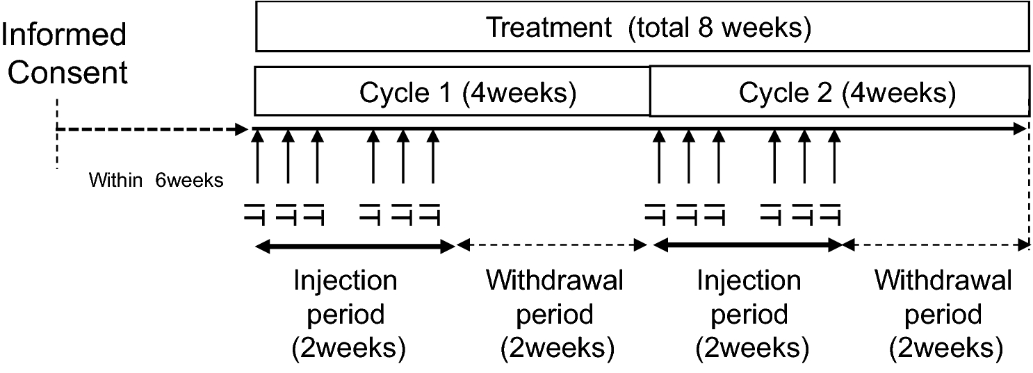 16]. Erythema and heat due to local inflammation repeatedly appeared but receded over time. In addition, a transient fever was able to be suppressed by premedication, such as non-steroidal anti-inflammatory drugs (NSAIDs) and acetaminophen. The fever was considered to have been induced by cytokines, such as interferon-γ. Since a dose of 60,000 mNAU was confirmed to be safe, this dose will likely continue to be used in future clinical trials.