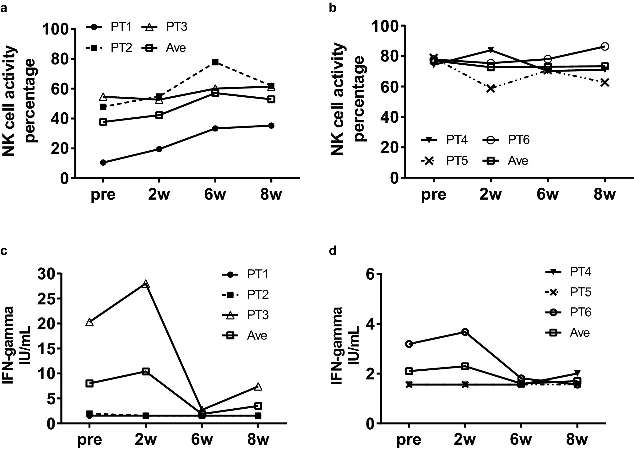 5). The NK cell activity increased immediately after the administration of GEN0101, peaking at 6 weeks and followed by a gradual decrease in the low-dose group. This tendency was also seen during clinical studies, suggesting that the NK cell response was transient. There was little change in the NK cell activity in the high-dose group, possibly because of the high level of NK cell activity (about 80%) at baseline. IFN-γ levels increased transiently after six administration sessions at two weeks, which was considered to contribute to the activation of CTL. According to an in vitro study, HVJ-E can induce dendritic cell maturation [