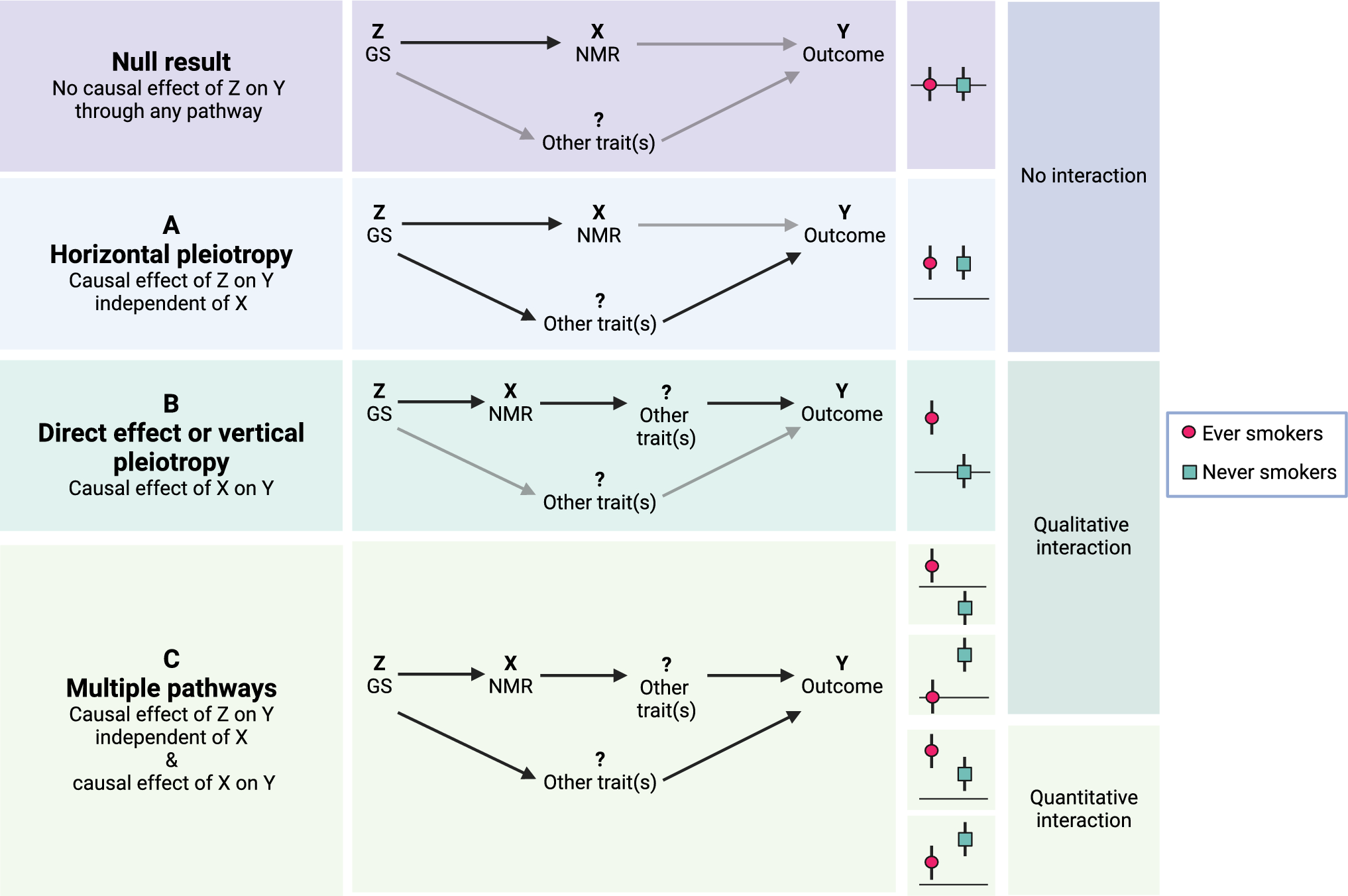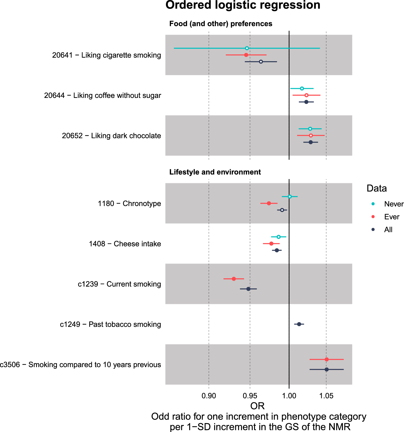 We wanted to perform the PheWAS separately for ever and never smokers to distinguish whether the associations were independent of nicotine metabolism or indicative of a possible causal pathway through nicotine metabolism (Fig. 1), an approach described by Millard et al. [24]. To reduce noise, we excluded experimenters and occasional smokers from our Ever and Never subsets. We created a new Ever-Never variable based on two existing variables: