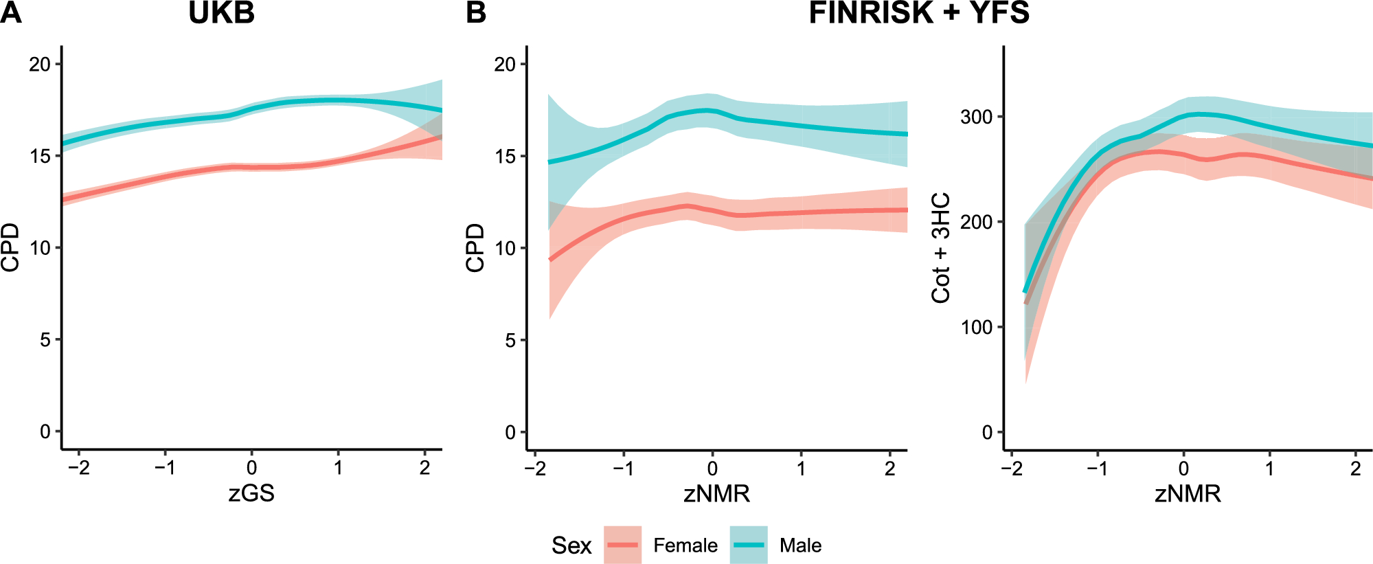 To assess the performance and reliability of our GS, we plotted it against the NMR top SNP (rs56113850) in the UKB data. In our previous study, the top SNP alone explained 23 % of the variance in the NMR (see Buchwald et al [15], Table S5). Among current smokers, we also plotted cigarettes smoked per day (CPD) against our GS as CPD has been shown to associate positively with the NMR [8, 9]. Additionally, we tested the association of the GS with CPD with a linear model. We did this by first regressing out sex, age and the first ten principal components of genetic structure, and then inverse normalizing CPD. We used the whole data but also split the data into two: lower and higher ends of the GS. We used 0 as the cut-off point based on the bend apparent in the loess curve of the scatter plot (Fig 2) and to obtain roughly the same sized groups as the mean was close to the median (Table 2). In order to have a reference point, we used our Finnish data to create plots of CPD against the NMR, as well as Cot+3HC, a biomarker for nicotine intake, against the NMR.