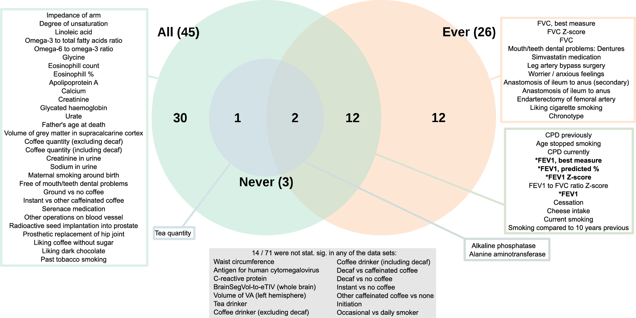 It is also essential to understand what traits or diseases the NMR is associated with. This knowledge is critical for assessing possible side-effects and other opportunities for drug development. A previous study by Chenoweth et al. showed the NMR to be associated with ethnicity, gender, hormonal replacement therapy, BMI, cigarettes smoked per day (CPD), and number of alcohol drinks/week [17]. In that hypothesis-driven study, the variables investigated had been carefully chosen based on previous literature. Therefore, unknown and potentially important associations may have been missed.