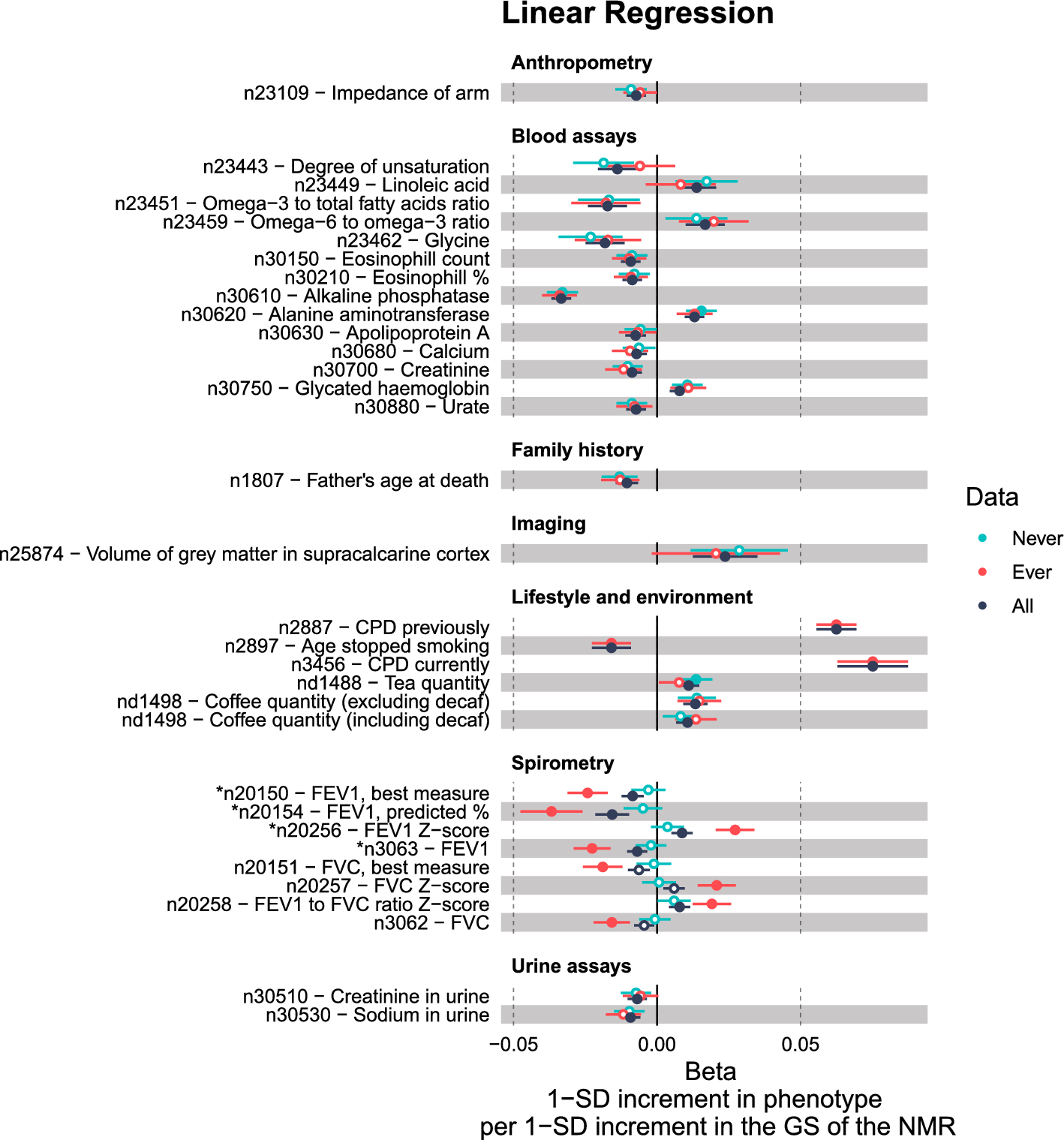 UK Biobank (UKB) is a population-based prospective study on genetic and non-genetic determinants of diseases of middle and old age. The cohort consists of over 500,000 participants from the UK, aged between 37–73 at recruitment (2006–2010) [26]. The resource comprises imputed genome-wide genotype data from all participants [27], along with a comprehensive range of phenotypic data. This includes data from clinical assessments, questionnaires, sample assays, and health record linkage—many of which are available from all of the participants (see Sudlow et al. [28]). Of note, the NMR is not available in the UKB data.