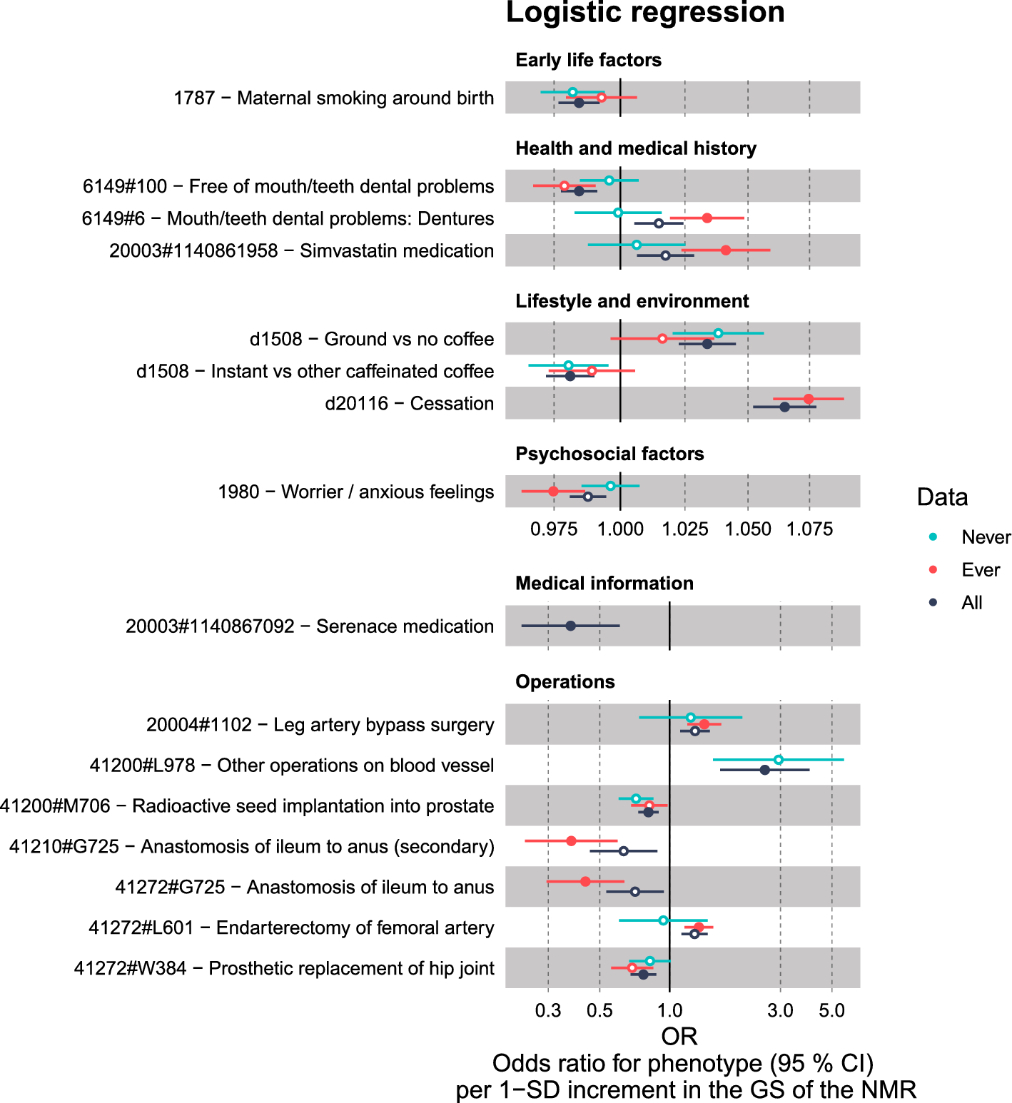 Our aim was to assess how the NMR is associated with the phenome without limiting ourselves to any specific category of phenotypes by using the UKB data (n = 343,662). Additionally, our objective was to assess ever and never smokers separately in order to distinguish whether the associations reflected a causal pathway through a) the NMR, either directly or through other traits such as amount smoked (effect only seen in ever smokers), b) some other pathway not including the NMR (same effect seen also in never smokers), or c) both (effect only seen in never smokers, or there are quantitative or directional differences in the effect sizes between ever and never smokers). Our findings contribute valuable information for drug development and personalized interventions for treating nicotine addiction, as well as, for example, cancer, given CYP2A6’s role in metabolizing various drugs, including the chemotherapeutic agents letrozole and tegafur [21, 22].