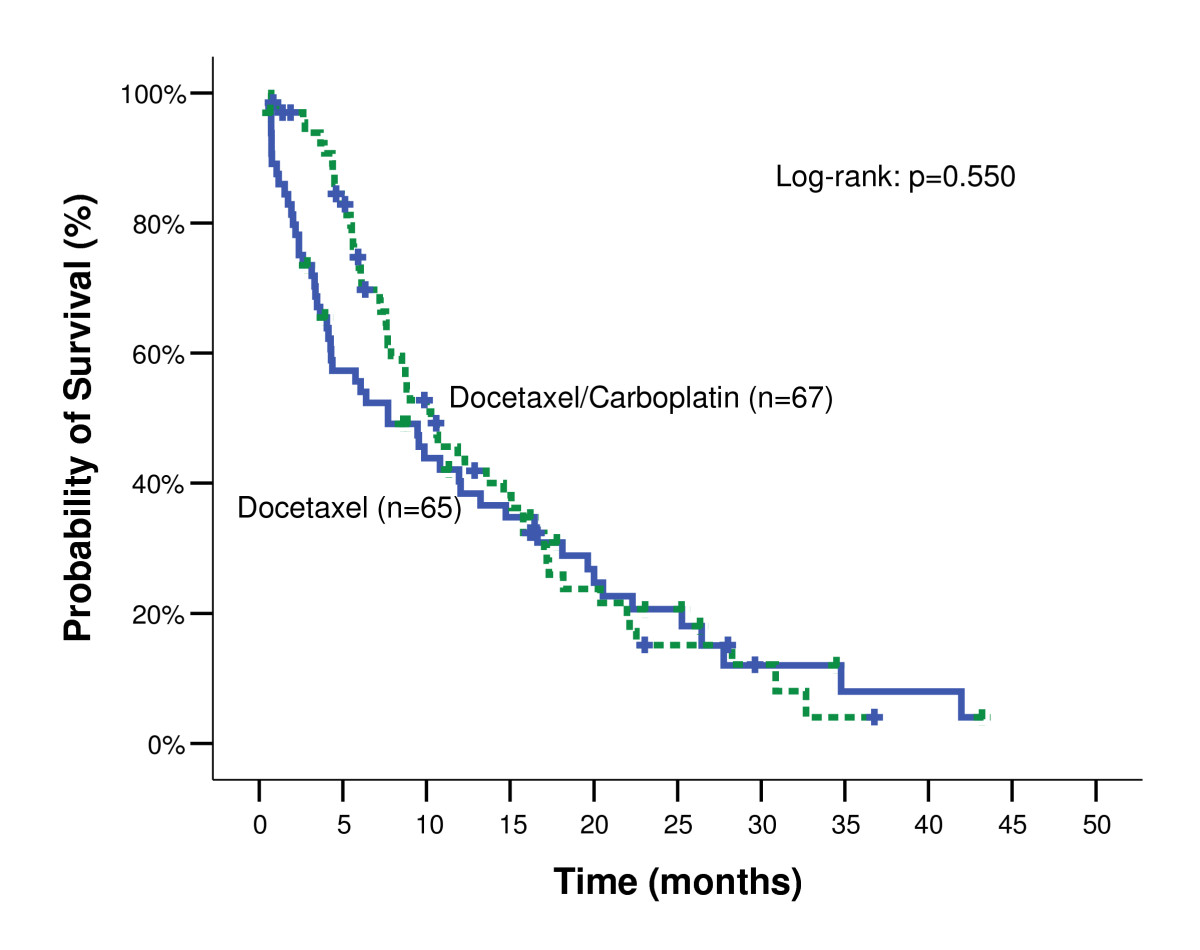 The primary end-point was overall survival (OS); secondary endpoints included overall response rate (ORR), safety profile and progression-free survival (PFS) associated with each regimen. The study was designed to have 90% power (α = 0.05, two-sided log-rank test) to detect an increase in median survival from 4 months for the single agent docetaxel arm [