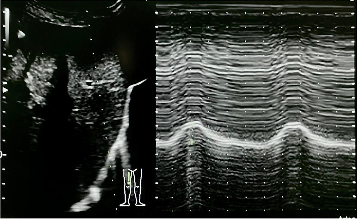 A low-frequency (3.5–5 MHz) ultrasound transducer is used to identify the right hemidiaphragm. The M-mode then is employed to show movements and measure diaphragmatic excursion (cm)