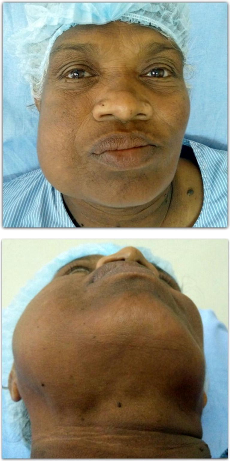 Preoperative clinical photographs of the right mandibular swelling