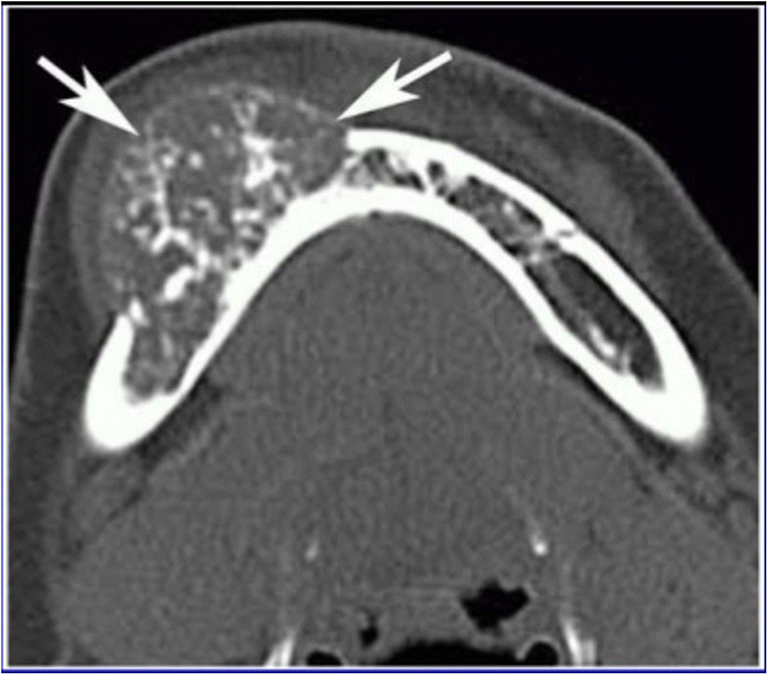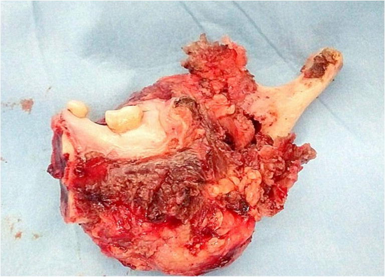 A 56-year-old female with multiple comorbidities presented with a swelling in the lower jaw (Figs. 1 and 2). On examination, it was a hard 6 × 5 cm swelling in the right mandible, 3 cm from the symphyses and posteriorly involving the angle of the mandible. The oral cavity did not show any evidence of disease. Also, a 3 × 2 cm nodule in the right lobe and 1 × 1 cm nodule in the left lobe of the thyroid were palpated without cervical lymphadenopathy. Laryngoscopy revealed both the cords to be mobile. Fine-needle aspiration cytology revealed a Bethedsa 1, i.e., few follicular cells. A trucut biopsy was undertaken from the mandibular swelling, which revealed a metastatic lesion from the thyroid which was positive for thyroglobulin and CKT. A bone scan of Tc-99 was done as part of the metastatic evaluation and showed an increased uptake in the right body of the mandible. Contrast-enhanced CT neck showed a 2.8 × 2.9 × 1.6 calcific nodule in the right lobe of the thyroid, a 1.2 × 1 cm hypointense nodule in the left lobe of the thyroid, and a 4 × 3 cm contrast-enhanced osteolytic lesion in the right body of the mandible Fig. 3. The patient was counseled regarding the need for surgery and consent was obtained for the same. A total thyroidectomy with hemimandibulectomy and adjacent level 1 B node clearance was done Figs. 4 and 5. Postoperative period was uneventful and she was discharged on postoperative day 4. Histopathological examination proved it as a pT3NoM1 follicular variant of papillary carcinoma of the thyroid, hence staged as IVB. American Thyroid Association (ATA) risk of recurrence is High Risk to which she received 100 mCi. Her follow-up thyroglobulin, antithyroglobulin, and low-dose scan were within normal limits. Hence, she can be categorized as Excellent response as per the Dynamic Risk Stratification. She is to be maintained on a suppressive dose of thyroxine (latest value of TSH—1.1 ng/dl). She is on regular follow-up, and 1 year since the surgery, there are no signs of recurrence.