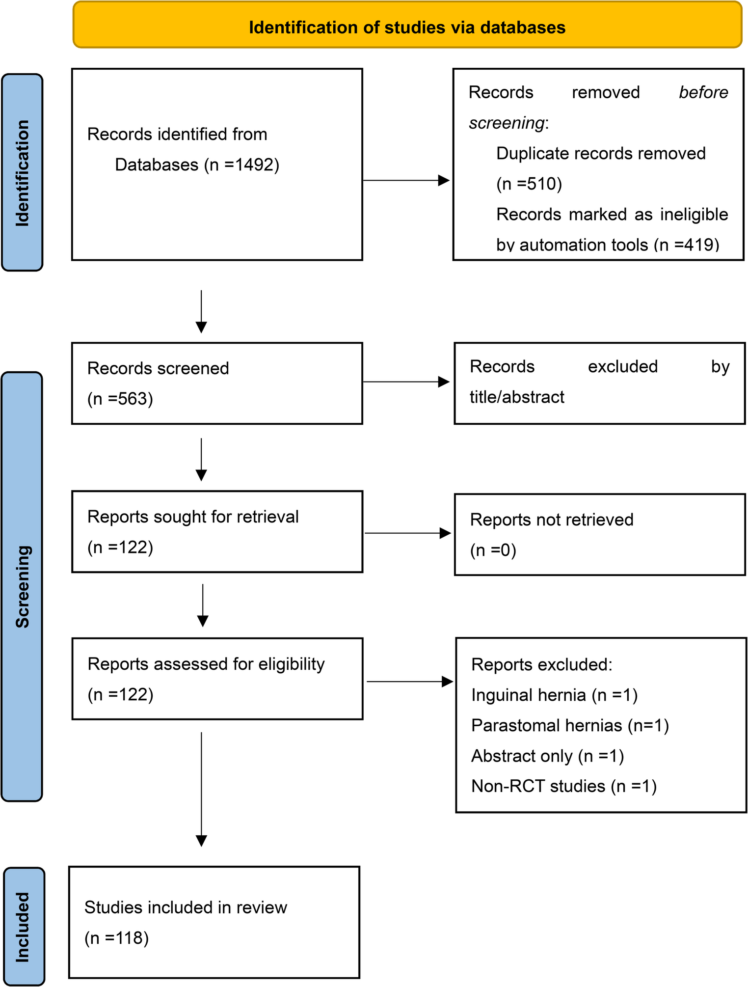 A total of 1492 manuscripts were identified in the initial search. After removing duplicate references, and applying the filter function in Rayyan to mark records containing the following exclusion keywords: systematic review, meta-analysis, survey, case report, observational, and non-randomized, 563 studies were screened by title and abstract, of which 122 full texts were retrieved, with 118 studies finally included [10‐127] (Fig. 1).