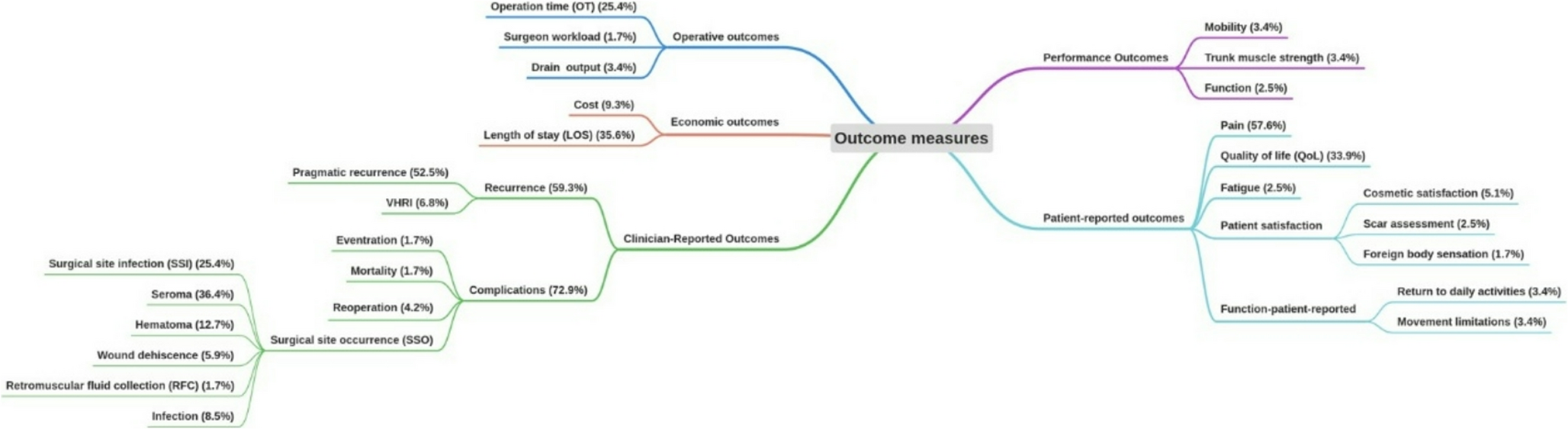The most commonly reported primary outcomes were hernia recurrence, operative complications, and pain. Secondary outcomes frequently included healthcare/resource utilization, pain, QoL, and complications. These outcomes could broadly be categorized as either patient-reported or non-patient-reported, with the latter assessed by surgeons or other clinical evaluators—being more prevalent.