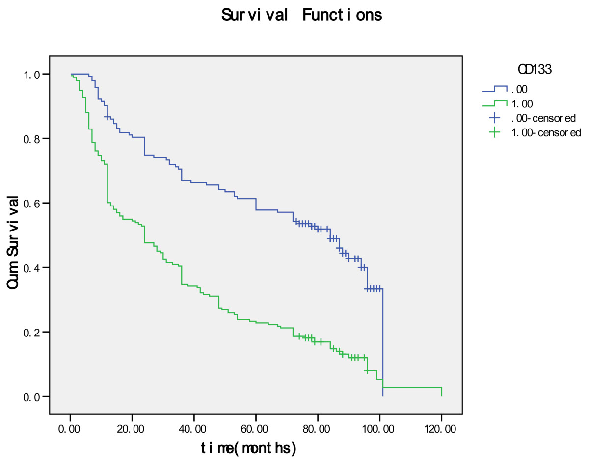 17]. In this research, the expression of CD133 positively correlates with the shorter survival time, suggesting CD133-positive cells may contain more cancer stem-like cells. Thus residual cancer stem-like cells after routine therapy may lead to tumour recurrence and metastasis through the self-renewal and multilineage differentiation with agreement of cancer stem cell hypothesis [