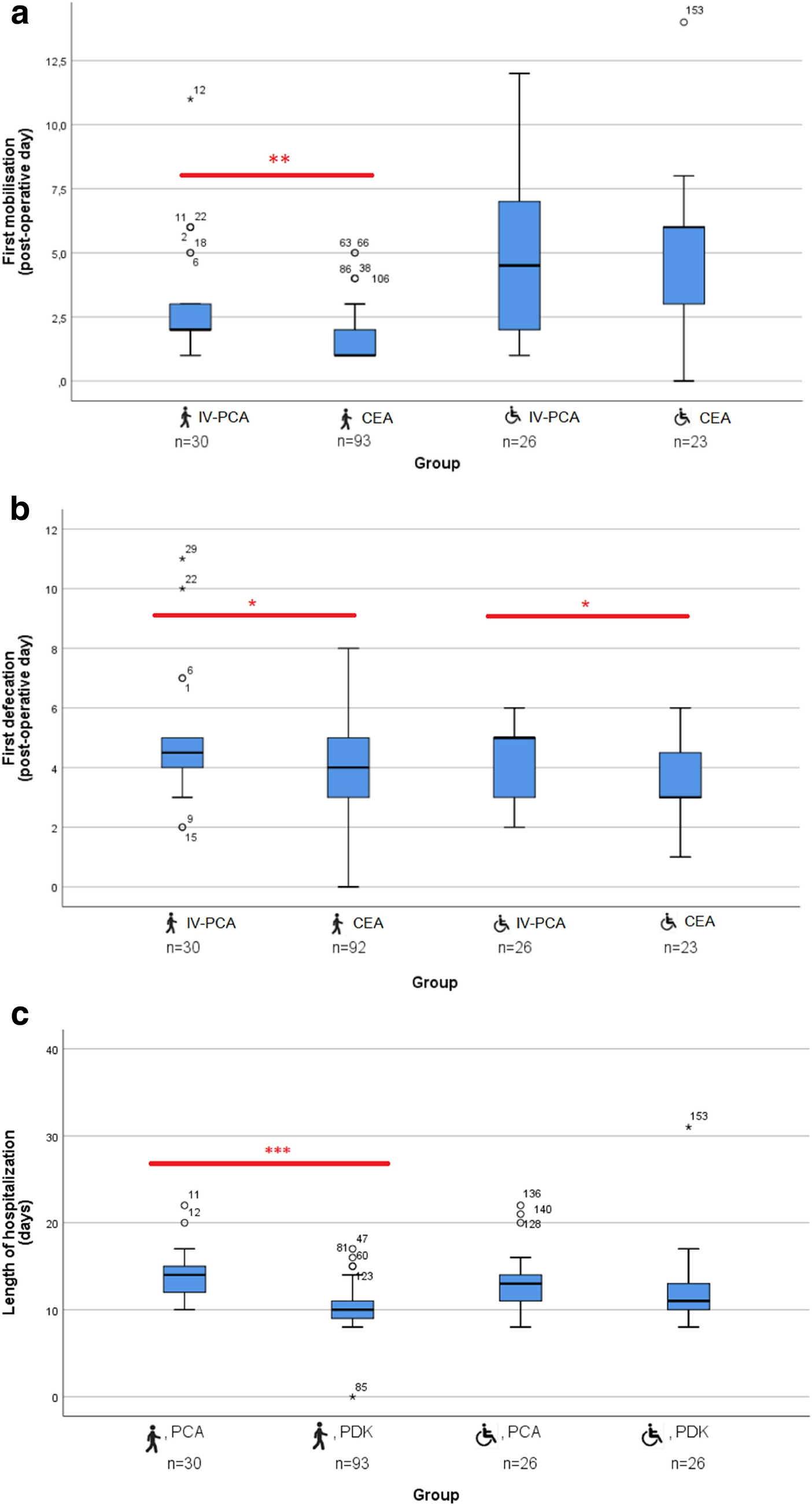 Healthy children who received CEA started mobilization 1 day earlier than children with IV-PCA (p = 0.002). First postsurgical defecation was seen earlier in all children who received CEA in both groups (H; Day 4 vs. Day 5, p = 0.011, I; Day 3 vs. Day 5, p = 0.044). Healthy children who received CEA were discharged from hospital 4 days earlier than their IV-PCA counterparts (p < 0.001). No statistically significant difference in postoperative nausea nor in vomiting was identified between groups. Transient neurological irritations were seen in 9.7% of the patients in the CEA group.