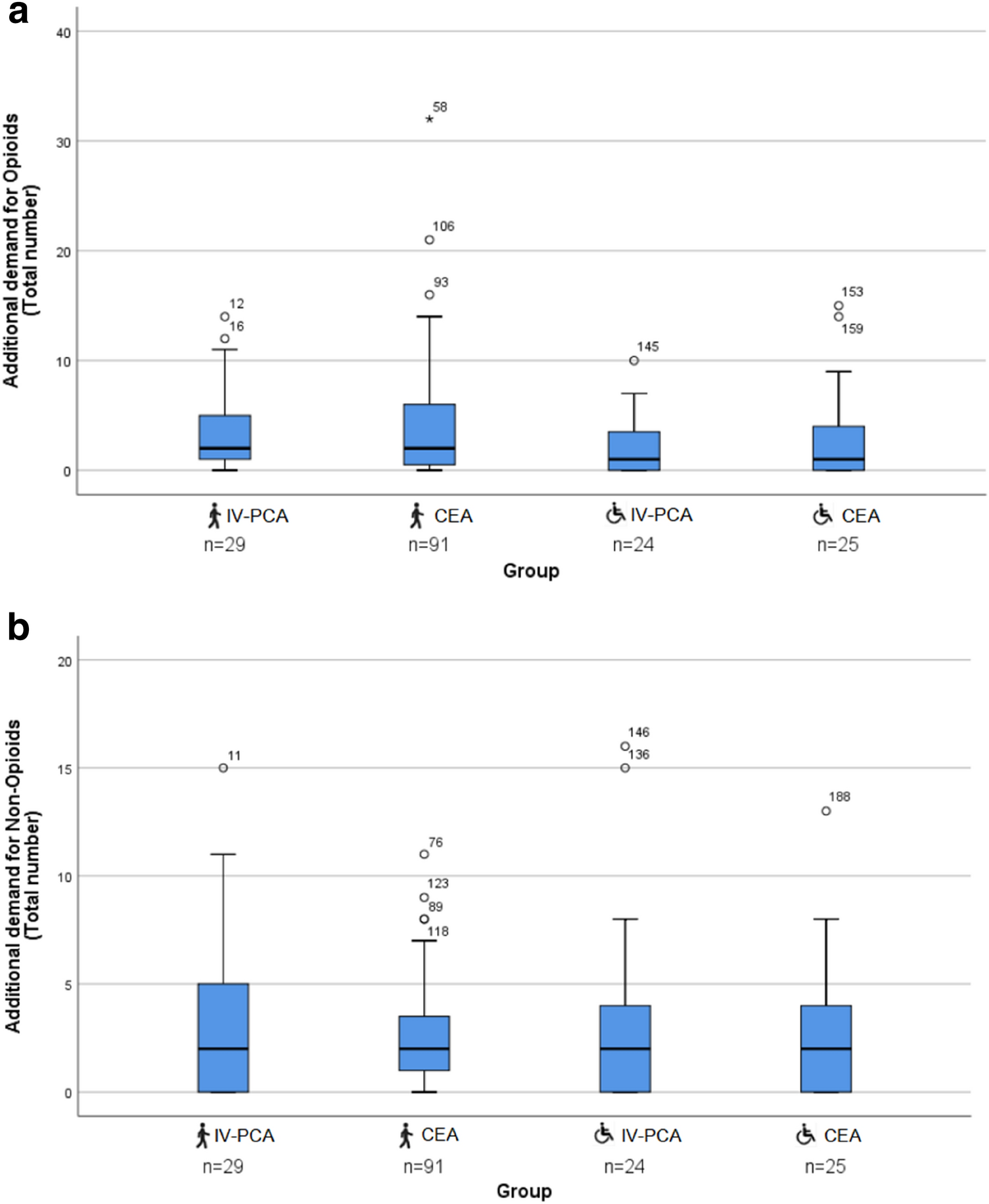) children. Extreme outliers are marked with an asterisk (*) on the boxplot. Mild outliers are marked with a circle (O) on the boxplot. b Boxplots of each group depicting additional demand for non-opioids (total number) of healthy (