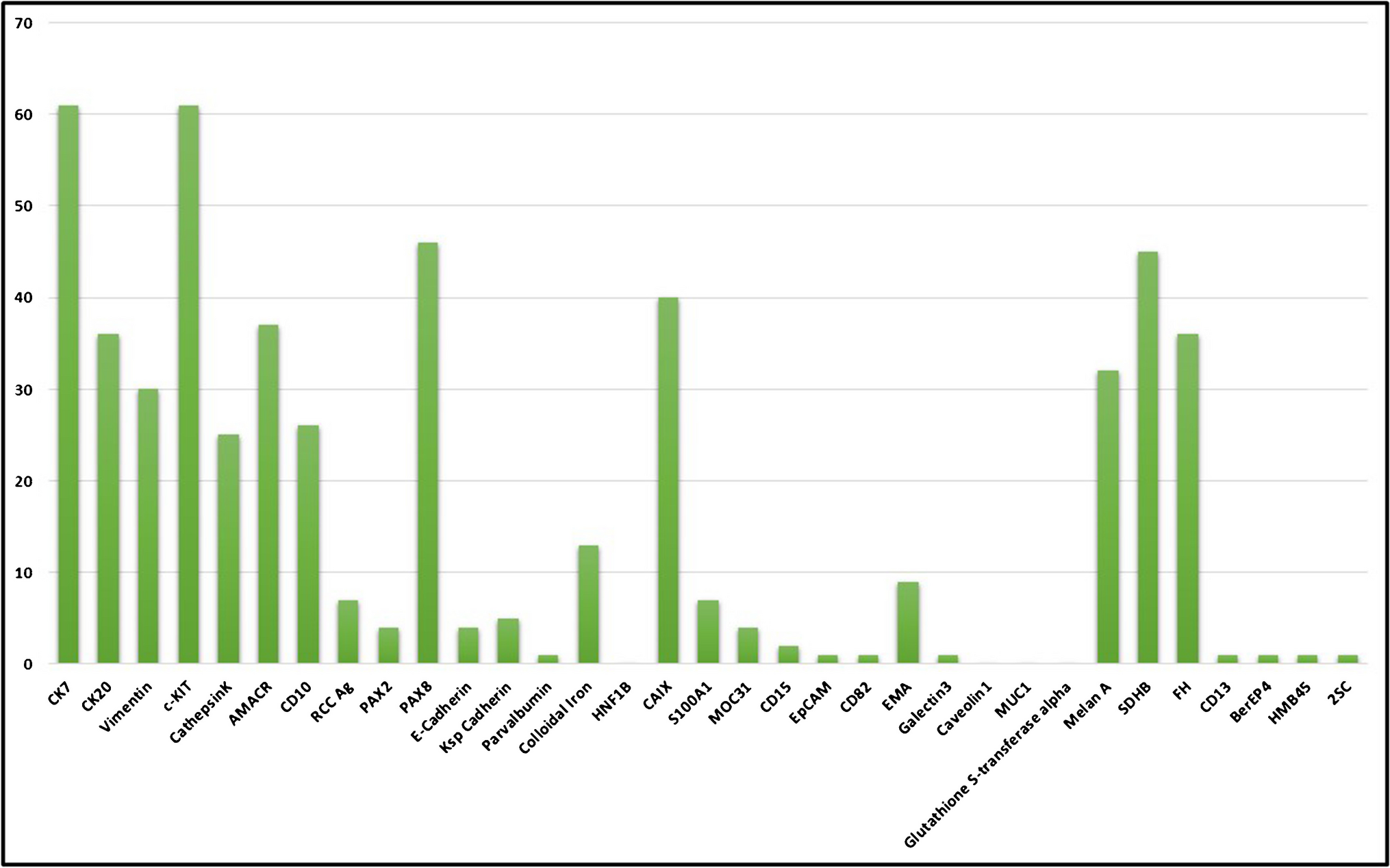 Bar graph depicting the immunohistochemical stains of choice used by the survey participants in the differential diagnosis of eosinophilic renal tumors