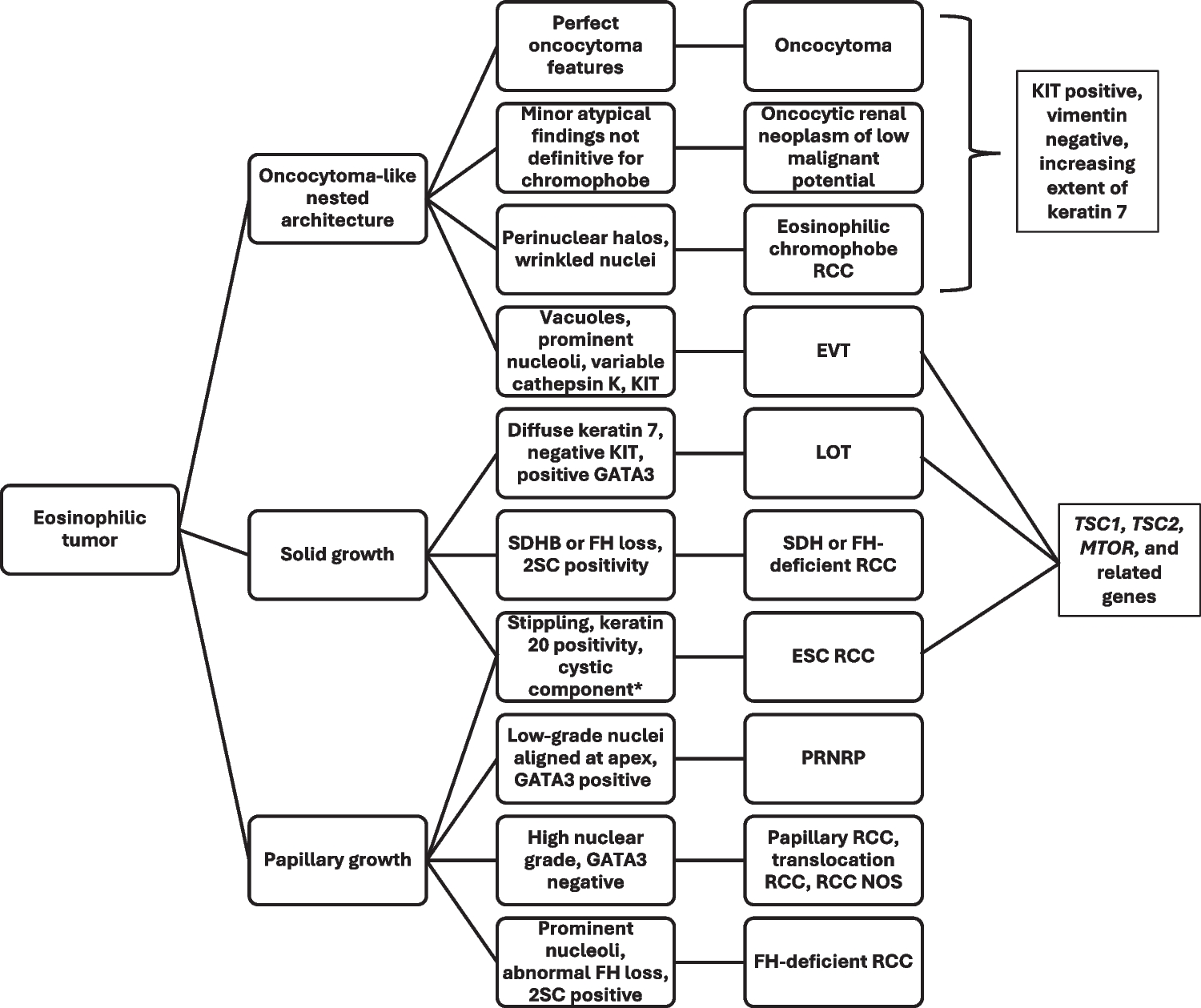 A flowchart shows a potential algorithm for discriminating eosinophilic renal tumors, with emphasis on emerging subtypes. Abbreviations: RCC, renal cell carcinoma; EVT, eosinophilic vacuolated tumor; LOT, low-grade oncocytic tumor; ESC, eosinophilic solid and cystic; PRNRP, papillary renal neoplasm with reverse polarity; NOS, not otherwise specified. *Not all features are present in every tumor