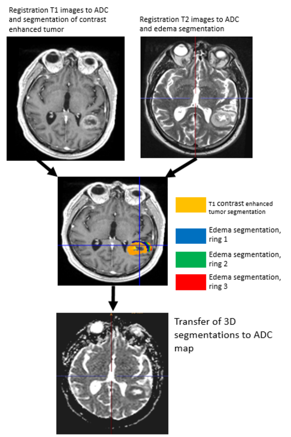 Segmentation, registration of T1 contrast enhancing MR images as well as T2 images zo corresponding apparent diffusion coefficient (ADC) maps. We subdivided the peritumoral space into three adjacent ring-shaped spaces with an orthogonal diameter of each 3 mm and calculated the mean ADC of each ring as well as the ADC slope from the outer to the inner ring