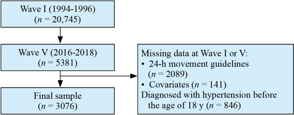 For this longitudinal study, data were taken from the Add Health project, which followed a nationally representative group of U.S. adolescents in grades 7–12 into adulthood. Wave I, carried out in 1994, involved 20,745 in-home interviews [12]. Data from Wave V and biomarker data from 2016 to 2018 (n = 5381, age 33–39 years) were also used. After missing data were excluded and individuals who were diagnosed with hypertension before the age of 18 were removed, 3076 individuals were included in the analysis (Fig. 1). Among participants included and excluded in Wave V, there were no statistically significant differences in screen time (P = 0.514), sleep duration (P = 0.701), PA (P = 0.762), or demographic characteristics (ethnicity, P = 0.333; region, P = 0.324). Consequently, it is unlikely that the missing data significantly influenced the analysis results.