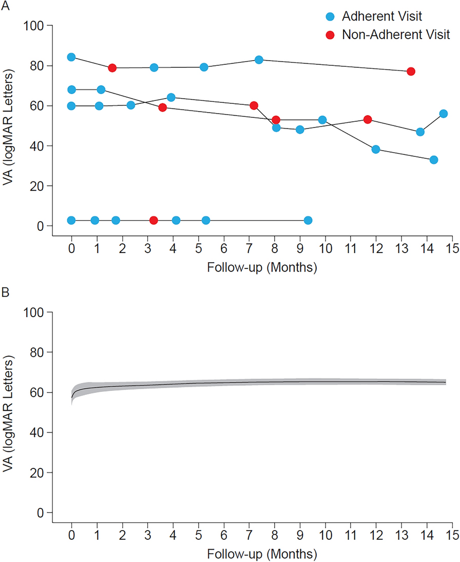 Overall, 133 patient eyes were included: 129 adherent, and four non-adherent. Mean (standard deviation) baseline VA was 57.0 (23.6) and 53.8 (35.3) letters in adherent and non-adherent patient eyes, respectively. Mean change in VA by month 12 was higher in adherent (6.3 letters) than non-adherent patient eyes (− 11 letters). Compared with the previous visit, adherent visits were associated with a mean increase in VA of 0.67 letters and non-adherent visits with a decrease of 2.30 letters.