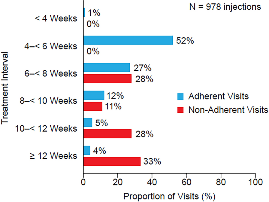 Patients who were adherent to treatment had shorter intervals between injections and most clinic visits resulted in an injection, reinforcing the importance of consistent therapy.