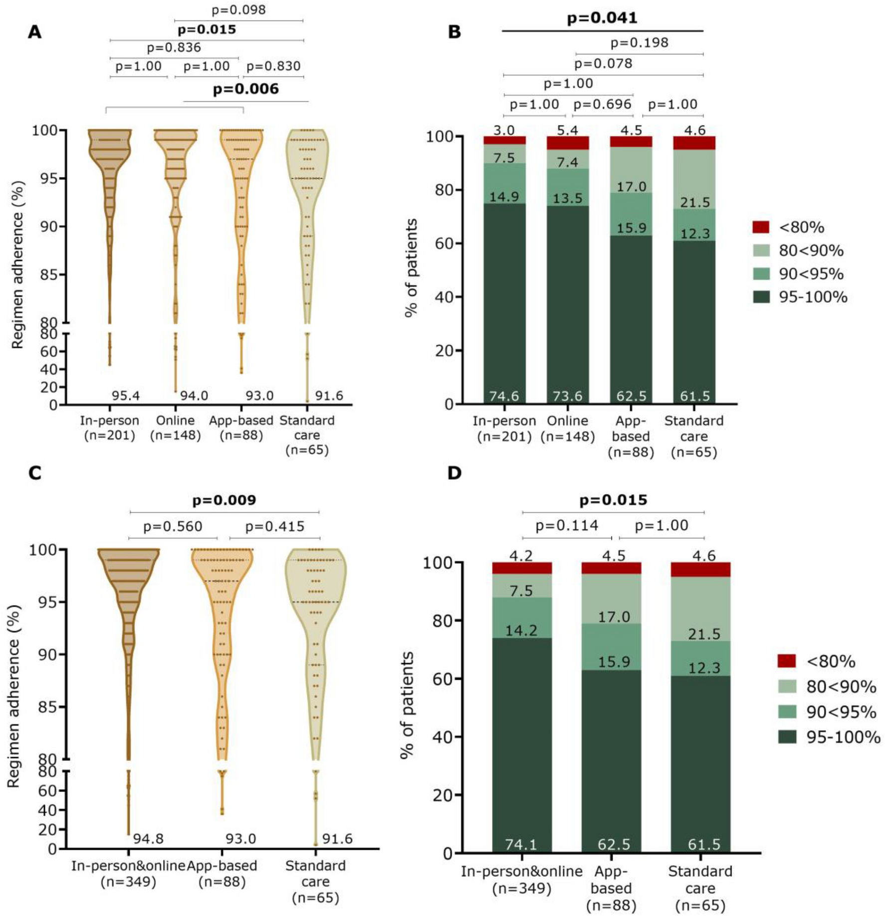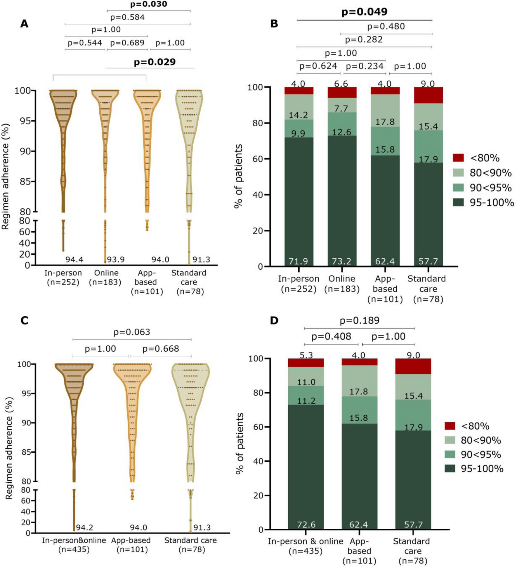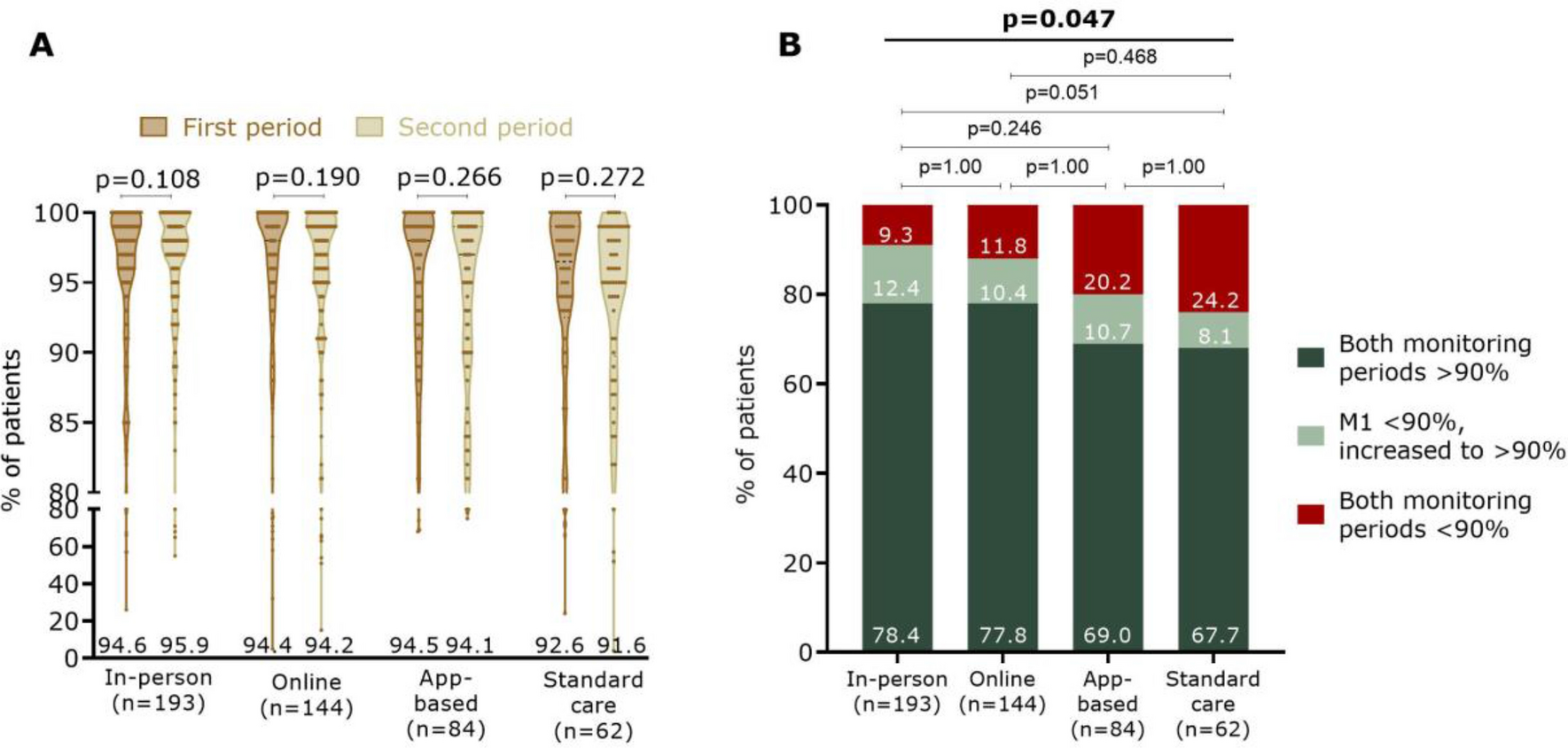 ≥ 90% adherence during both follow-ups | 363 (75.2) | 151 (78.4%) | 112 (77.8) | 58 (69.0) | 42 (67.7) | 0.165 |