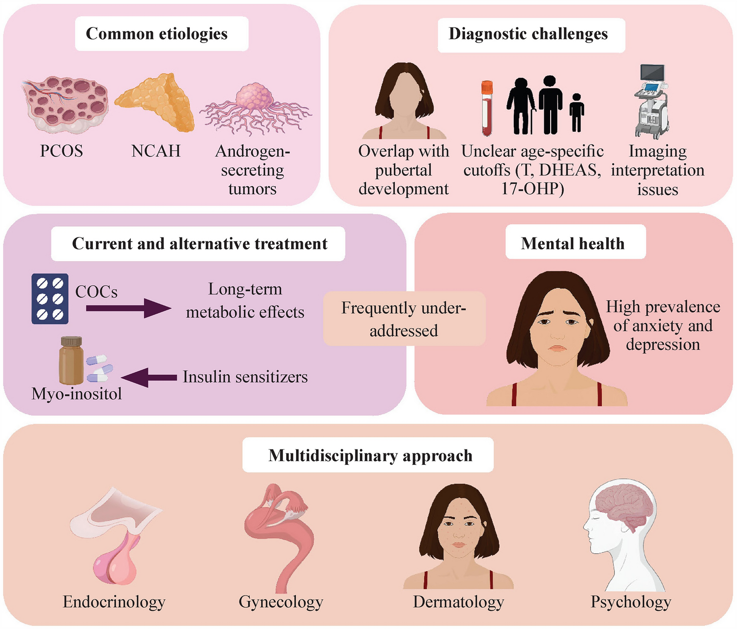 Adolescent hyperandrogenism demands multidisciplinary management involving endocrinologic, gynecologic, dermatologic, and psychological expertise. Future research must prioritize (1) validated age- and puberty-stage-specific diagnostic criteria; (2) safety/efficacy data for emerging therapies; and (3) standardized protocols for mental health screening. This synthesis provides a framework for evidence-based, individualized care while highlighting urgent research priorities.