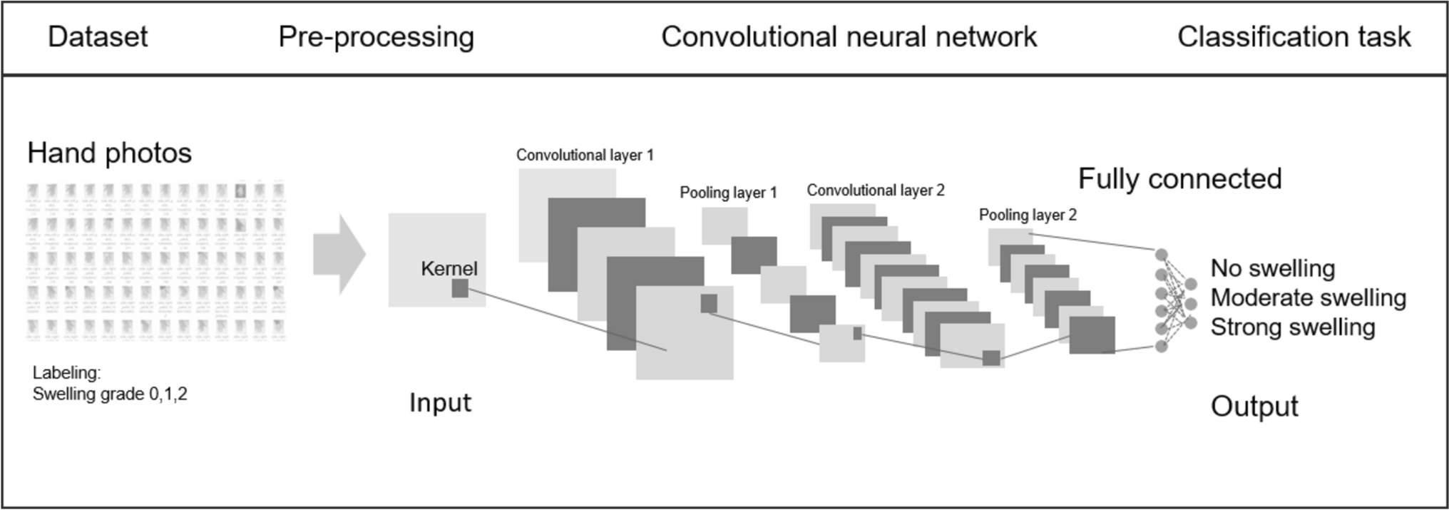 Convolutional neural network. Here with a classification task to predict joint swelling from hand photos of patients with rheumatoid arthritis