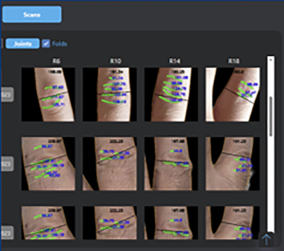 User-friendly telemonitoring technologies are also available for patients, such as utilizing smartphone cameras [41]. In our own study, DETECTRA involves the automatic recognition of finger creases as biomarkers for joint swelling [42]. Changes in finger creases occur during synovitis or periarticular swelling, creating an ‘inflammatory fingerprint’. This process is reversible, allowing us to detect not only inflammatory flares but also treatment responses. The process involves three steps: detecting the hand in a photo using keypoint detection, isolating the desired joints (e.g. finger joints), and recognizing and measuring finger folds (Fig. 3). This can be achieved through computer vision techniques such as Canny Edge Detection or Ridge Detection, although we achieved better results with a newly trained CNN considering crease pixel length and diameter. Another project uses single-camera motion detection to assess finger joint mobility. Finger joint movements are captured on a normal mobile phone camera and angles and speed are measured and (theoretically) transferred to the EMR (Fig. 4) [43].