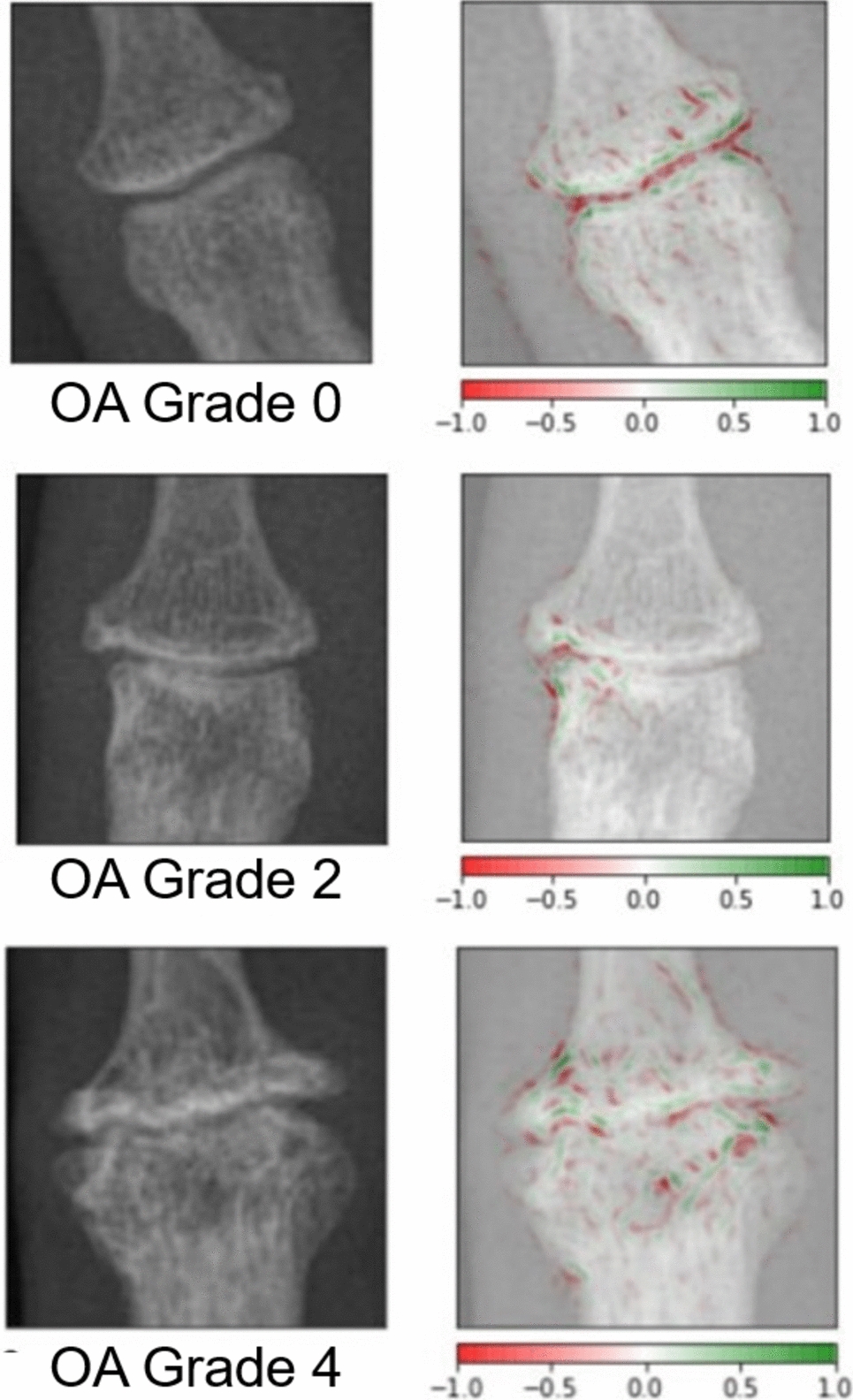 Image recognition is probably the easiest machine learning modality to be included in the clinical workflow [44]. This can start with an automatically generated radiology report. Several algorithms are already FDA-approved and in practice (e.g. detection of fractures or osteoarthritis) [25]. Heatmaps are, in my view, a promising candidate to be integrated into clinical practice. Heatmaps illustrate the region of interested for the algorithm, usually by color, and can guide the clinician to certain lesions [45]. A good example is the classification of osteoarthritis grades (Fig. 4), showing a conserved joint space in grade 0 versus osteophytes in grade 1 or diffuse subchondral bone remodeling in grade 4 [29]. Heatmaps are particularly popular in pathology for the evaluation of histological slides.