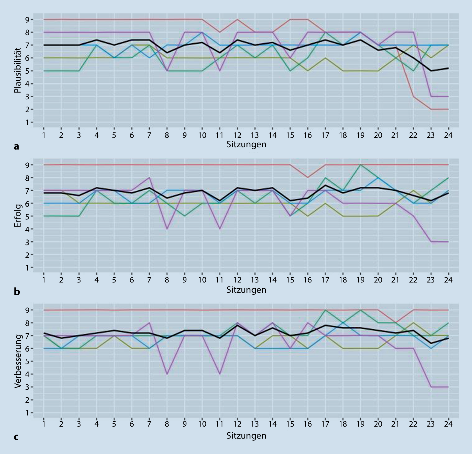 Mittelwerte von 3 Items des Credibility/Expectancy Questionnaire (CEQ; Devilly und Borkovec 2000) über 24 Therapiesitzungen der EFPI-Therapie (erwartungsfokussierte psychotherapeutische Interventionen) hinweg; n = 5. Schwarze Linie Mittelwerte der Bewertungen im Verlauf, bunte Linien Bewertungen der einzelnen Patienten und Patientinnen im Verlauf. Anmerkung: a „Wie plausibel erscheint Ihnen die angebotene Therapie (EFPI) zum jetzigen Zeitpunkt?“ (Plausibilität; Skala 1–9 [„überhaupt nicht plausibel“ – „sehr plausibel“]); b „Was denken Sie zum jetzigen Zeitpunkt, wie erfolgreich diese Therapie (EFPI) Ihre Beschwerden lindern wird?“ (Erfolg; Skala 1–9 [„überhaupt nicht nützlich“ – „sehr nützlich“]); c „Welche Verbesserung Ihrer Beschwerden erwarten Sie am Ende der Therapiezeit? (EFPI)“ (Verbesserung; Skala 1–9 [„überhaupt keine“ –9 „sehr starke“]); n = 5
