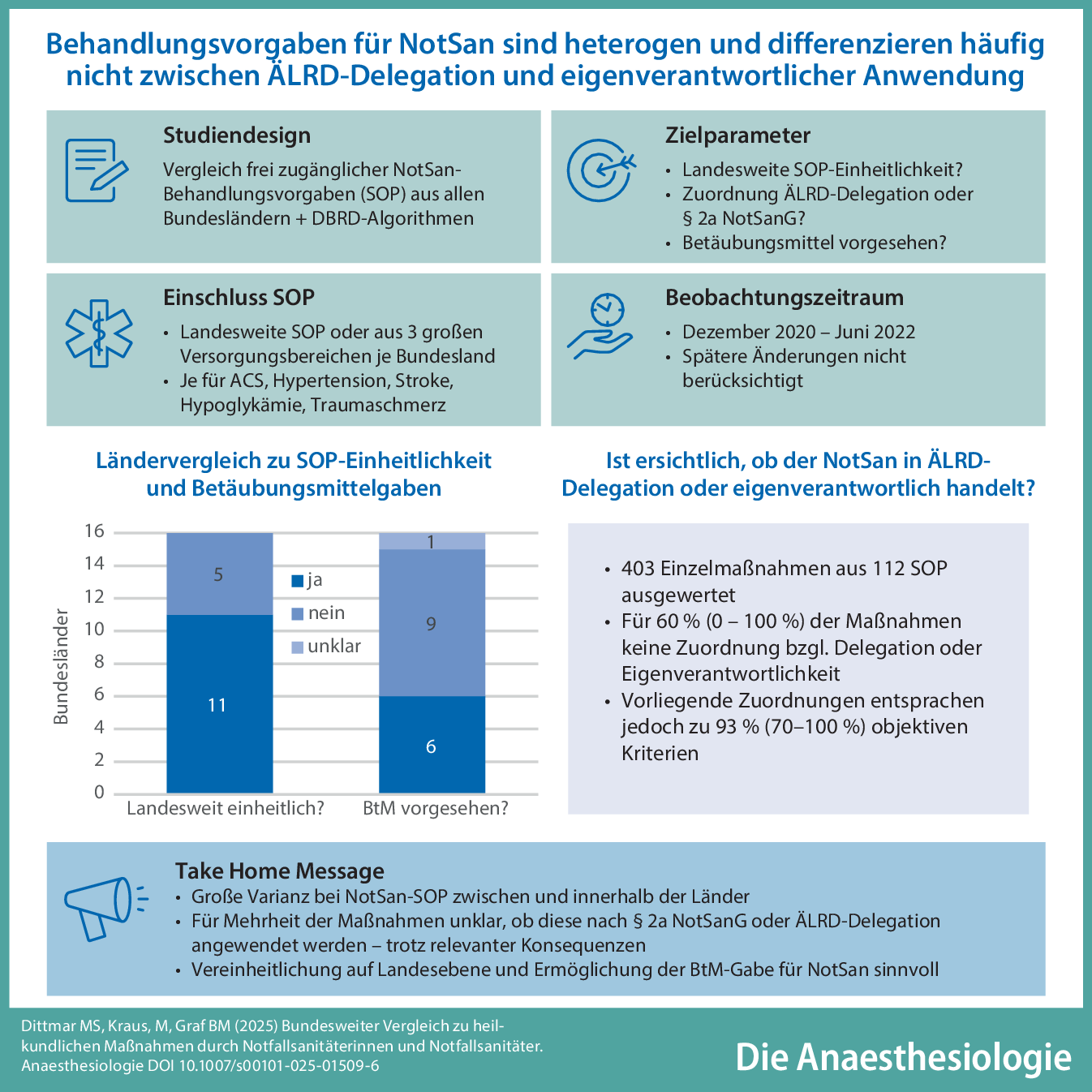 Eine Vereinheitlichung der NotSan-Behandlungsvorgaben zumindest bis auf Länderebene, die Implementierung der ÄLRD-Delegation und die Ermöglichung der Betäubungsmittelgabe für NotSan erscheinen sinnvoll.