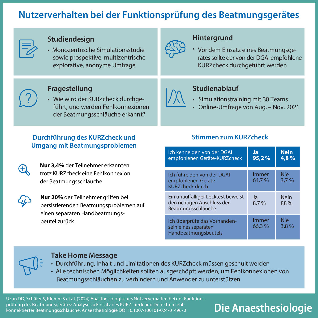 n = 28) der Teilnehmenden unmittelbar vor dem Anschluss des Simulationspatienten an das Beatmungsgerät diesen KURZcheck durch. Umso bemerkenswerter ist daher, dass trotz durchgeführtem KURZcheck nur einer von 28 Simulationsteilnehmern die Fehlkonnektion der Beatmungsschläuche bemerkt hatte. Angesichts der potenziell weitreichenden Folgen einer nichterkannten Fehlkonnektion von Beatmungsschläuchen ist dieses Ergebnis besorgniserregend und wirft Fragen zur Wirksamkeit derartiger Checks als gängige Sicherheitswerkzeuge auf. Bei bestehenden Beatmungsproblemen wird in den Handlungsempfehlungen der DGAI die Anwendung eines separaten Handbeatmungsbeutels empfohlen, um schnell zwischen patienten- und geräteseitigem Problem differenzieren zu können und eine möglichst zeitnahe Lösung des Beatmungsproblems zu erzielen [