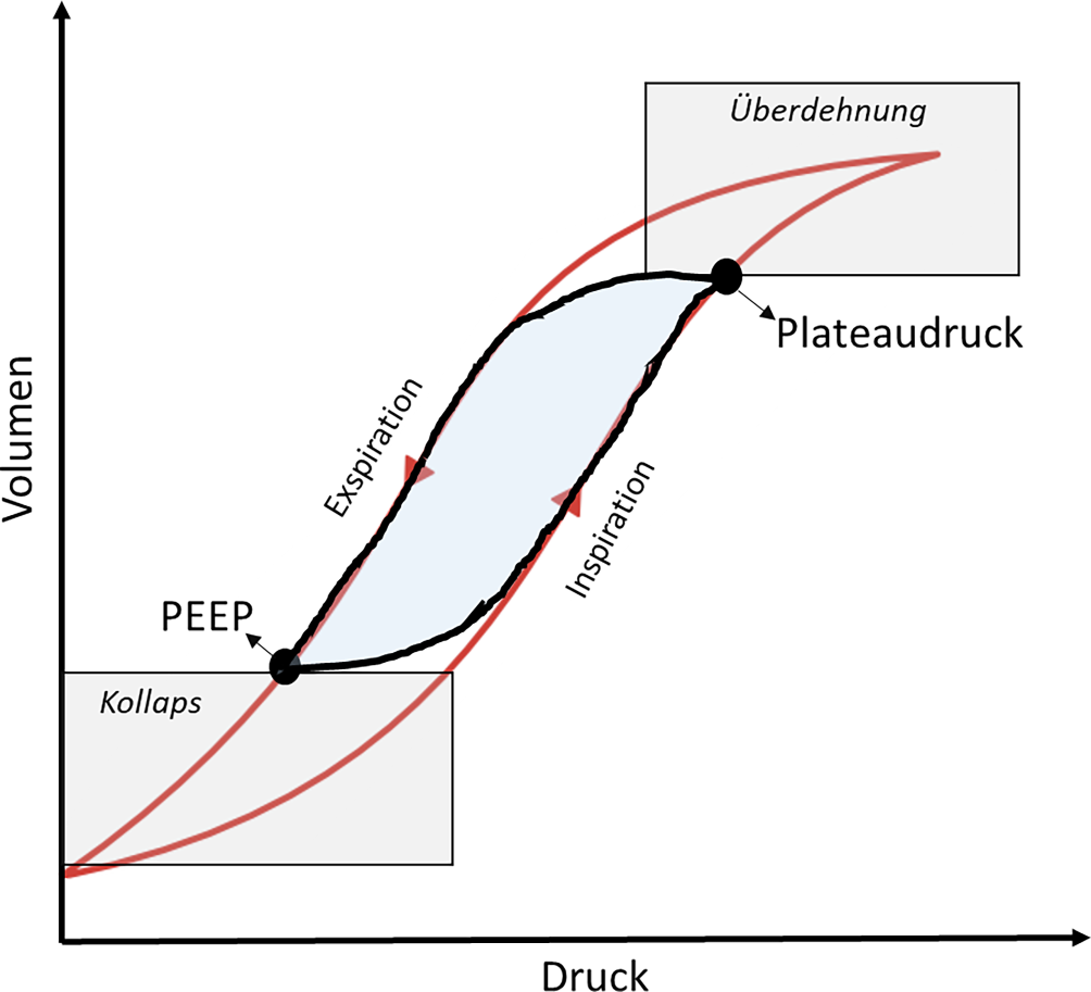 Atemmechanik | Rekrutierbare vs. nichtrekrutierbare Lungenareale; Compliance bzw. Elastizität des respiratorischen Systems; Pleuradruck bzw. transpulmonale Druckverhältnisse | Höherer PEEP bei Rekrutierbarkeit und hohem Pleuradruck |