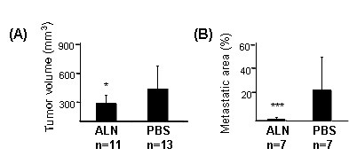 Our results were based on analyses at an end-point of 4 weeks, which limits the estimation of alendronate effects on tumor formation and progression to this time point. Future experiments with noninvasive imaging methods will allow following growth and spreading of orthotopic tumors at several intervening time points over an optimal time period without markedly expanding the numbers of experimental animals.