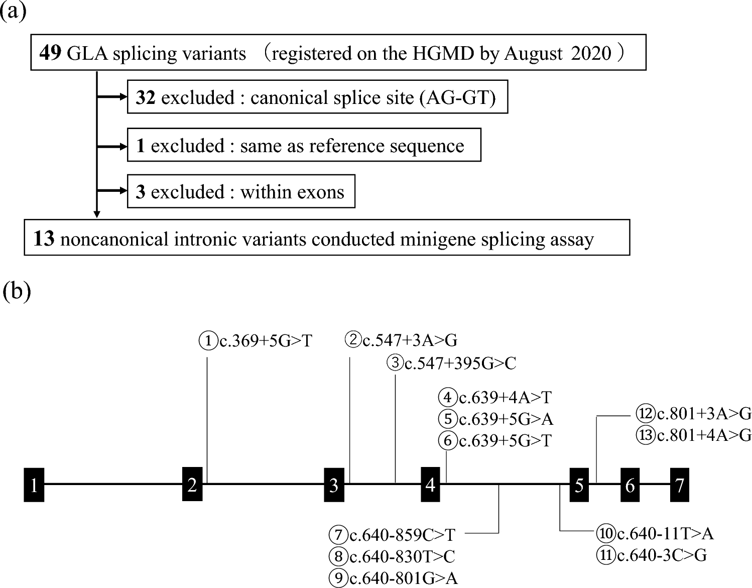 GLA gene registered in HGMD are located at canonical splice sites (dinucleotides at each end of the intron, usually GT at the 5′-end and AG at the 3′-end). Generally, these variants within canonical splice sites cause aberrant splicing because they impact highly conserved sequences that determine exon–intron boundaries [
