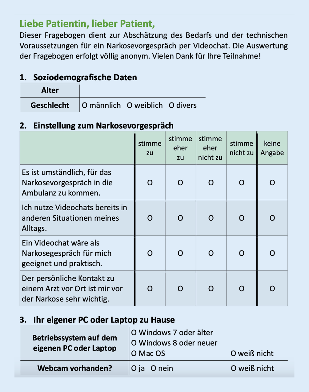 Mithilfe von einem Fragebogen sollen folgende Aspekte erhoben werden, die für eine potenzielle Einführung einer telemedizinischen Narkosevorbereitung relevant erscheinen: